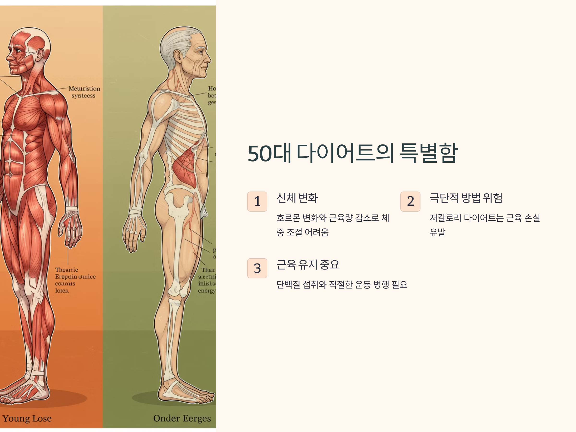 50대 이후에는 신체 변화가 두드러지며, 호르몬 변화와 근육량 감소로 인해 체중 조절이 더욱 어려워집니다. 젊을 때와 같은 방식으로 다이어트를 하면 오히려 건강을 해칠 위험이 큽니다. 특히, 극단적인 저칼로리 다이어트는 근육 손실을 유발하고 기초대사량을 더욱 낮출 수 있습니다.