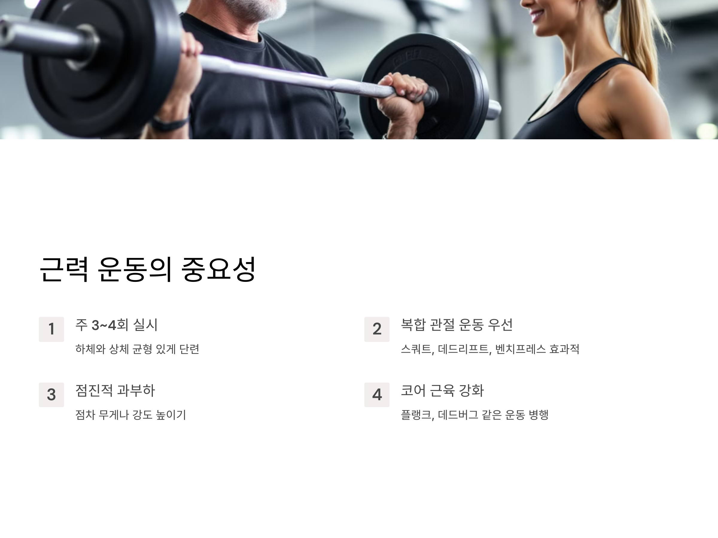 - 주 3~4회 근력 운동을 실시: 하체와 상체를 균형 있게 단련하는 것이 중요합니다.