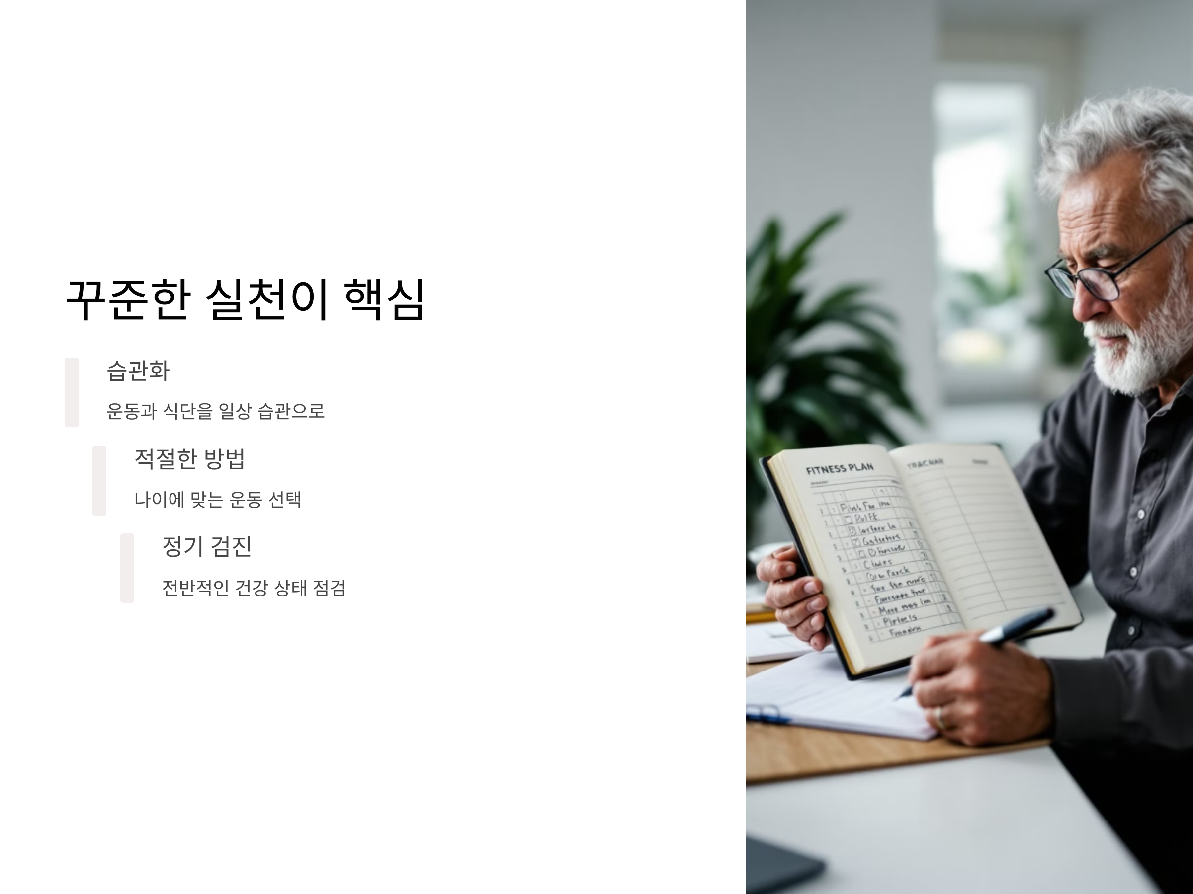 - 나이에 맞는 적절한 운동 방법 선택: 무리하지 않으면서도 효과적인 방법을 찾는 것이 중요합니다.