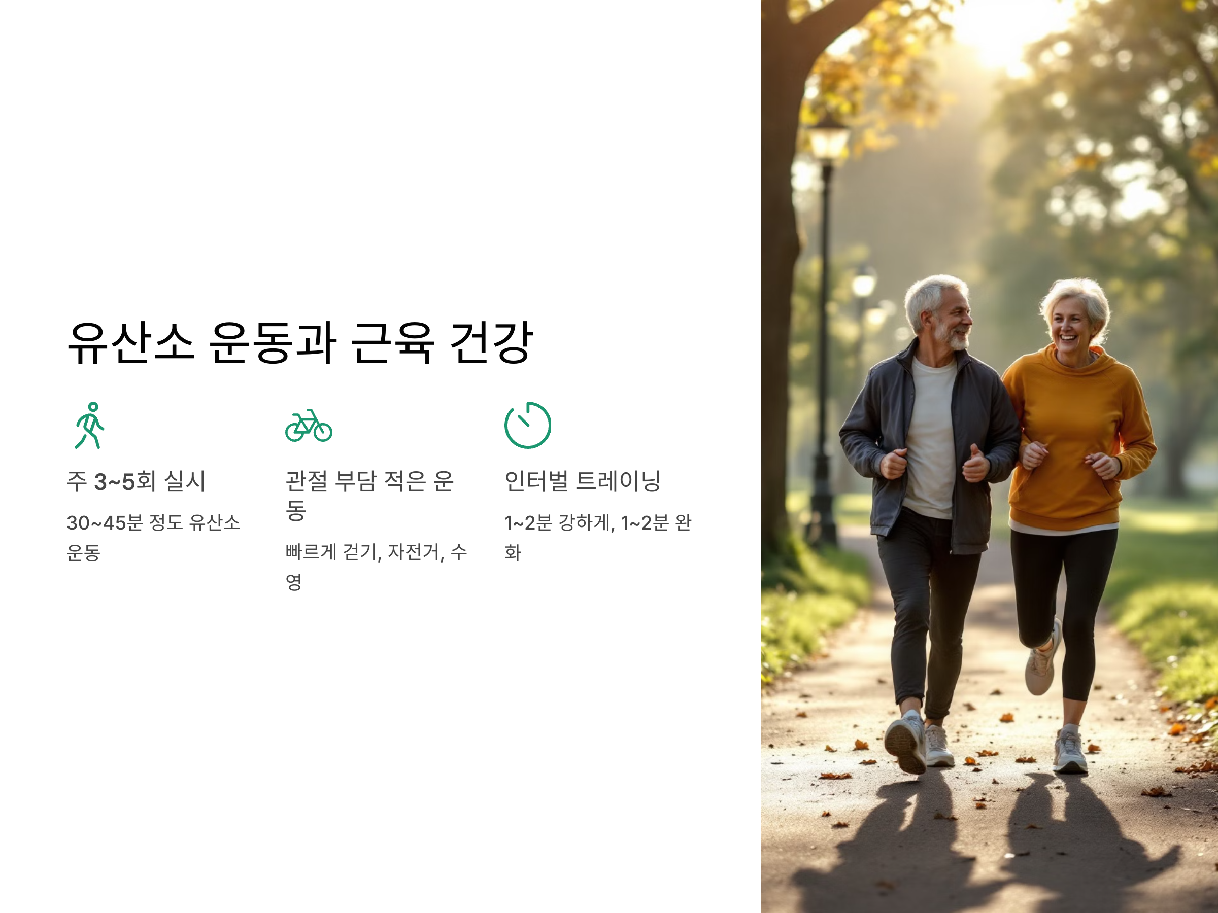 근력 운동뿐만 아니라 유산소 운동도 병행해야 건강한 신체를 유지할 수 있습니다. 적절한 유산소 운동은 혈액순환을 개선하고 근육 손실을 방지하는 데 도움을 줍니다.