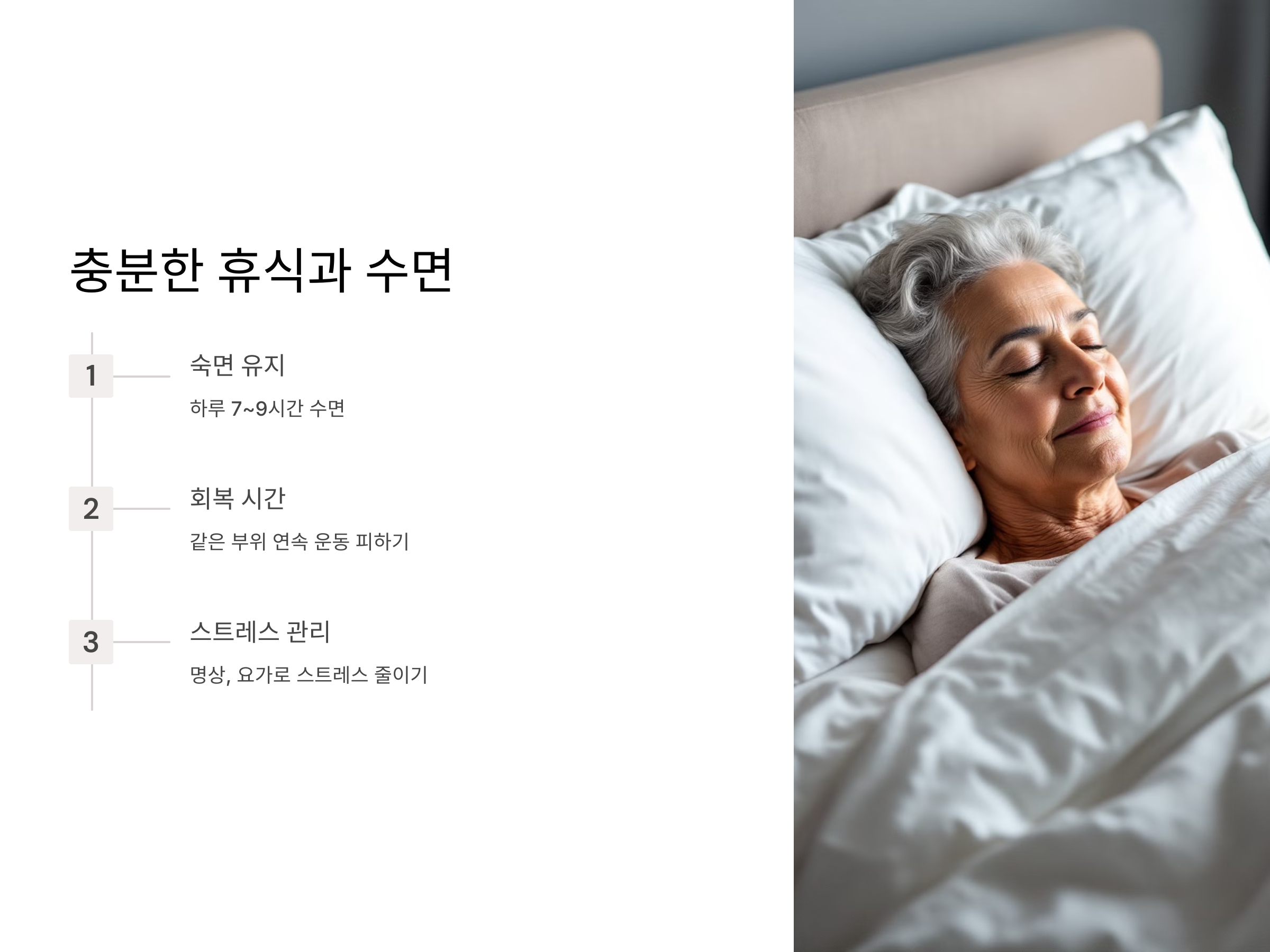 근육이 성장하고 회복되려면 충분한 휴식과 수면이 필요합니다. 특히 50대 이후에는 수면의 질이 떨어질 수 있으므로 이에 대한 관리가 필수적입니다.