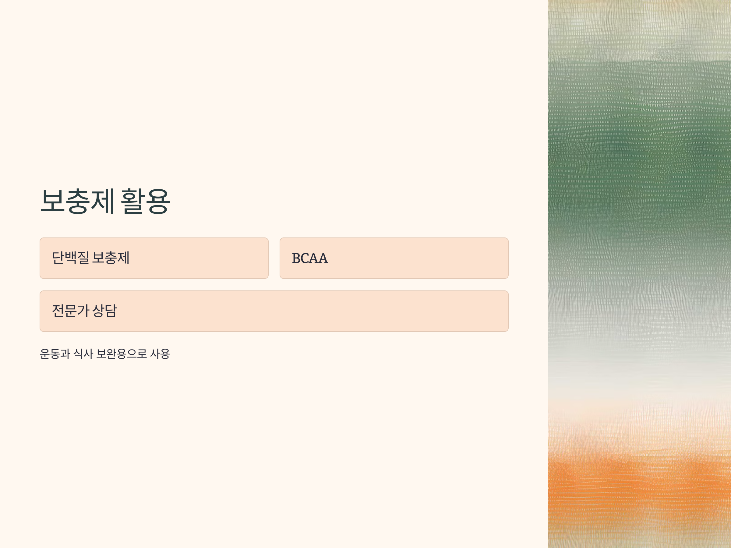 운동과 영양으로 근육량을 유지하기 어려운 경우, 보충제를 활용하는 것도 한 방법입니다. 특히 단백질 보충제나 BCAA(분지사슬아미노산)는 근육 회복과 성장을 도울 수 있습니다. 단, 보충제는 보조적인 역할을 하며, 기본적인 운동과 식사를 대신할 수는 없습니다. 보충제를 고려할 때는 전문가의 상담을 받는 것이 좋습니다.