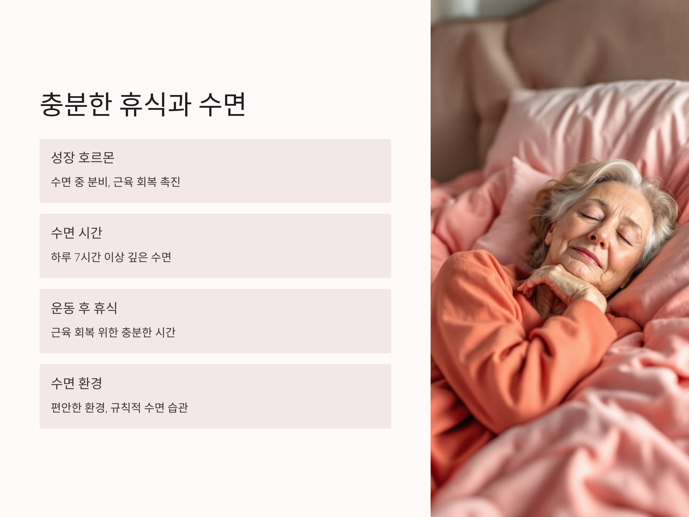 근육 성장과 회복은 휴식 중에 일어납니다. 충분한 수면을 취하는 것이 근육량을 유지하는 데 매우 중요합니다. 수면 중에 성장 호르몬이 분비되어 근육 회복과 재생을 촉진합니다. 50대 이후에는 수면의 질이 떨어질 수 있기 때문에, 수면 환경을 최적화하고 규칙적인 수면 습관을 유지하는 것이 중요합니다.