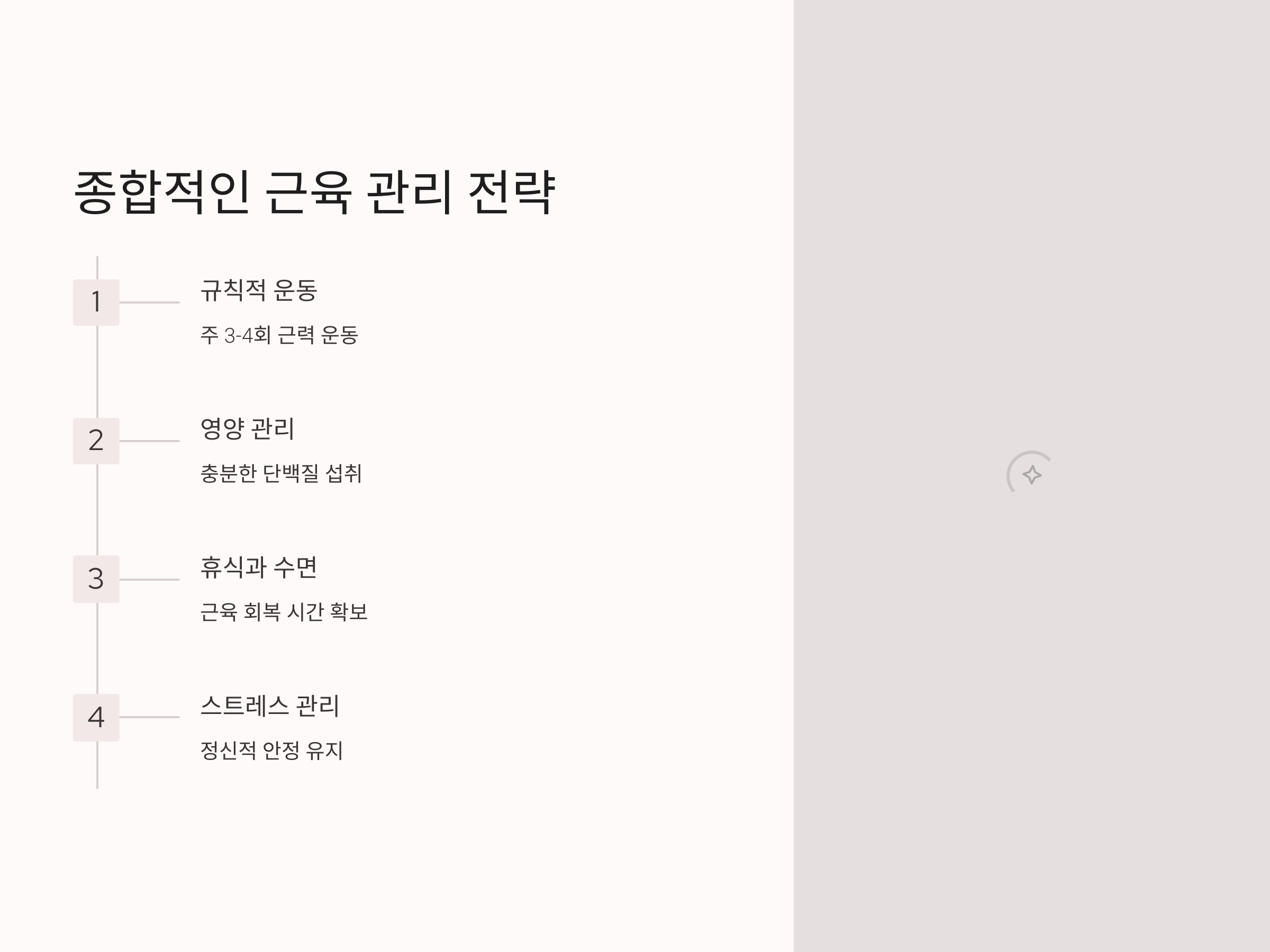 또한, 건강한 생활 습관을 유지하는 것이 중요합니다. 금연과 절주는 물론, 규칙적인 운동과 균형 잡힌 식사를 통해 전반적인 건강을 유지하는 것이 근육량 유지에 큰 도움이 됩니다.