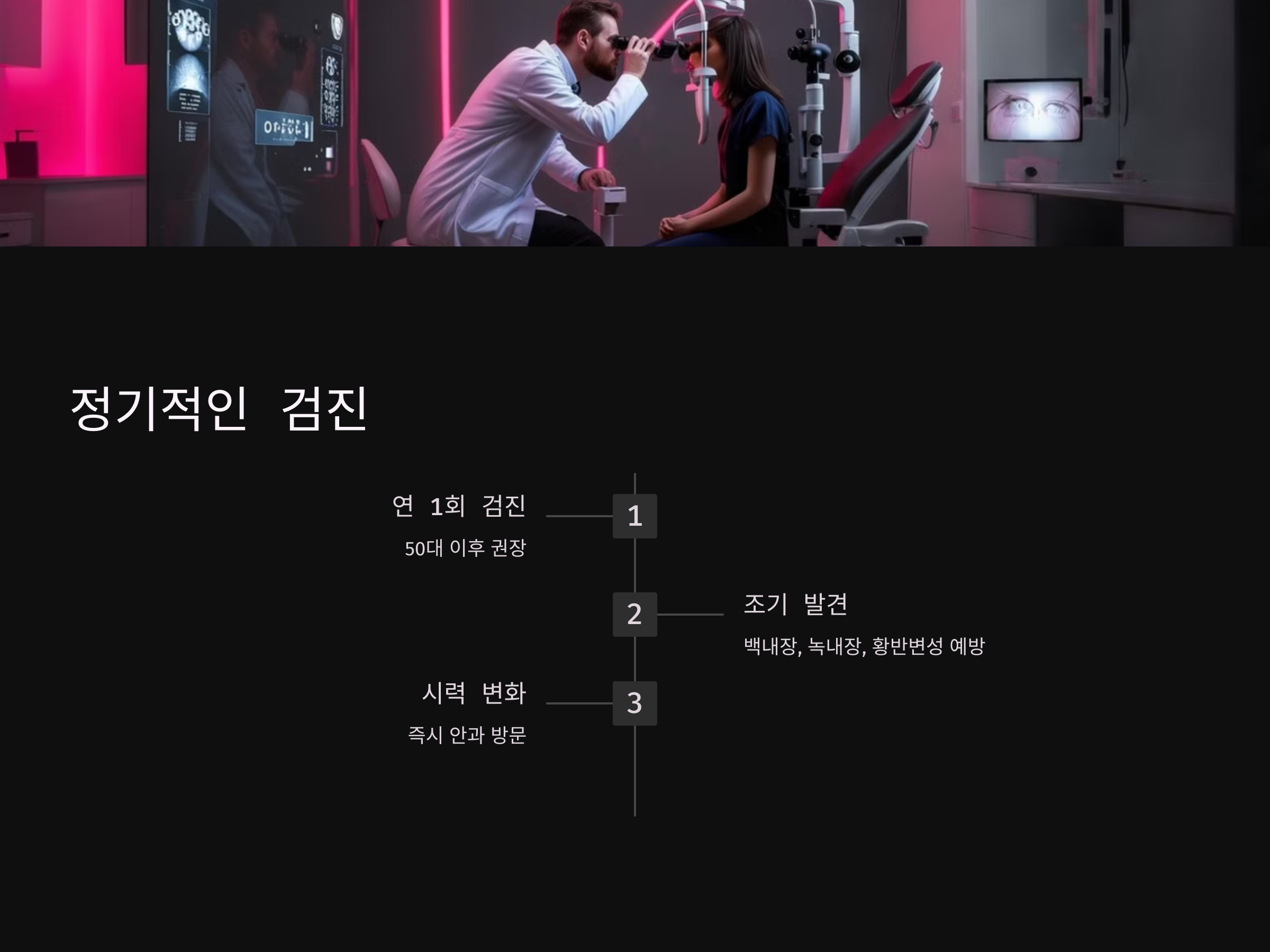 정기적인 검진을 통해 눈 상태를 체크하고, 시력 변화나 건강에 문제가 생겼을 때 빠르게 대응할 수 있습니다. 50대 이후에는 적어도 1년에 한 번씩 안과 검진을 받는 것이 권장됩니다.