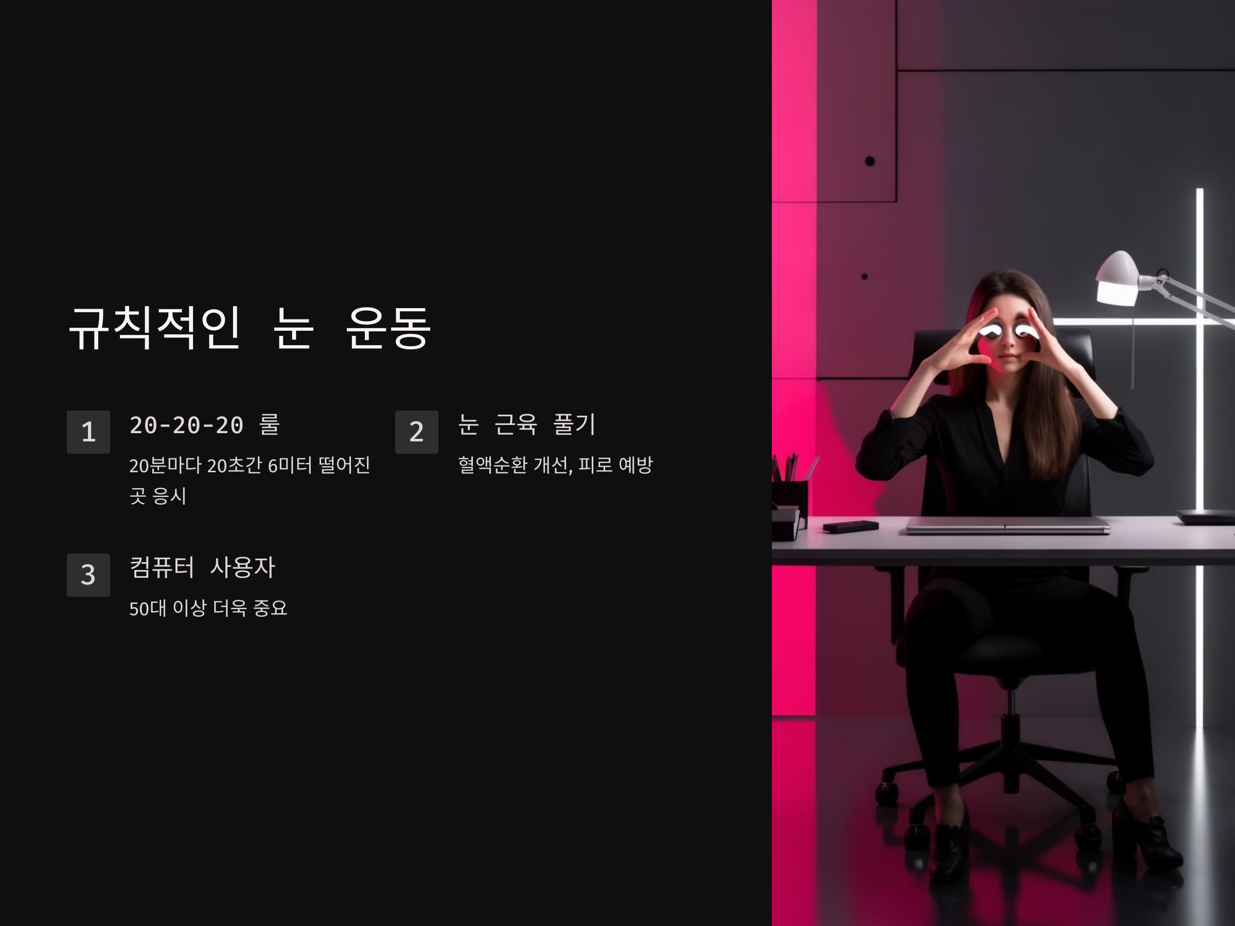 눈 운동을 통해 눈 근육을 풀어주고, 혈액순환을 개선하는 데 도움이 됩니다. 간단한 방법으로는 20-20-20 룰을 지키는 것이 있습니다. 20분마다 20초 동안 20피트(약 6미터) 떨어진 곳을 바라보는 방법입니다. 이 운동은 눈을 쉬게 하고, 긴장된 눈 근육을 풀어주어 눈 건강을 지키는 데 효과적입니다.