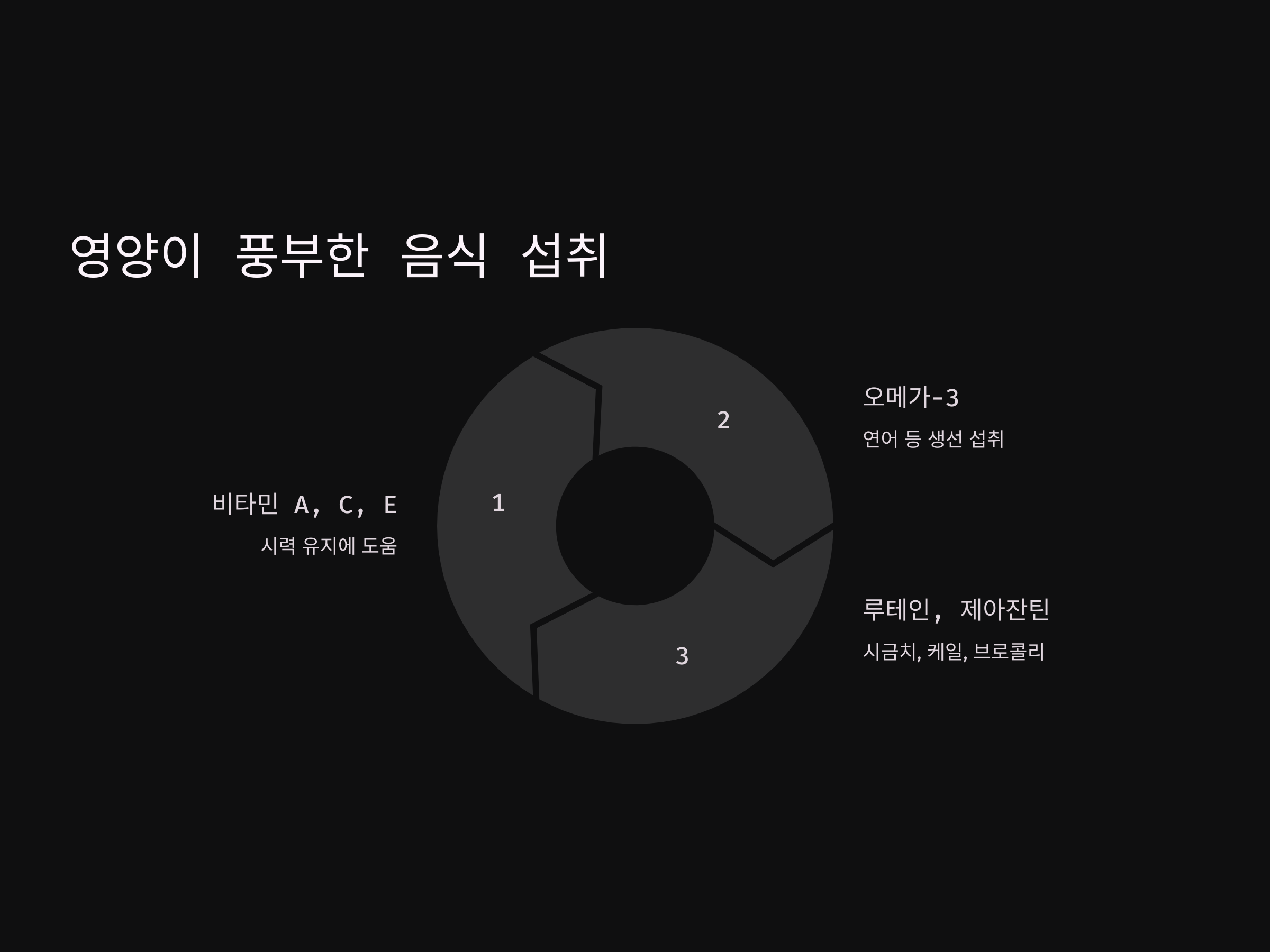비타민 A가 풍부한 당근, 시금치와 같은 식품을 섭취하거나, 오메가-3 지방산이 풍부한 연어와 같은 생선을 자주 먹는 것이 좋습니다. 또한, 루테인과 제아잔틴이 풍부한 음식은 망막 건강에 매우 중요합니다. 시금치, 케일, 브로콜리 등은 루테인과 제아잔틴이 풍부한 대표적인 식품입니다.