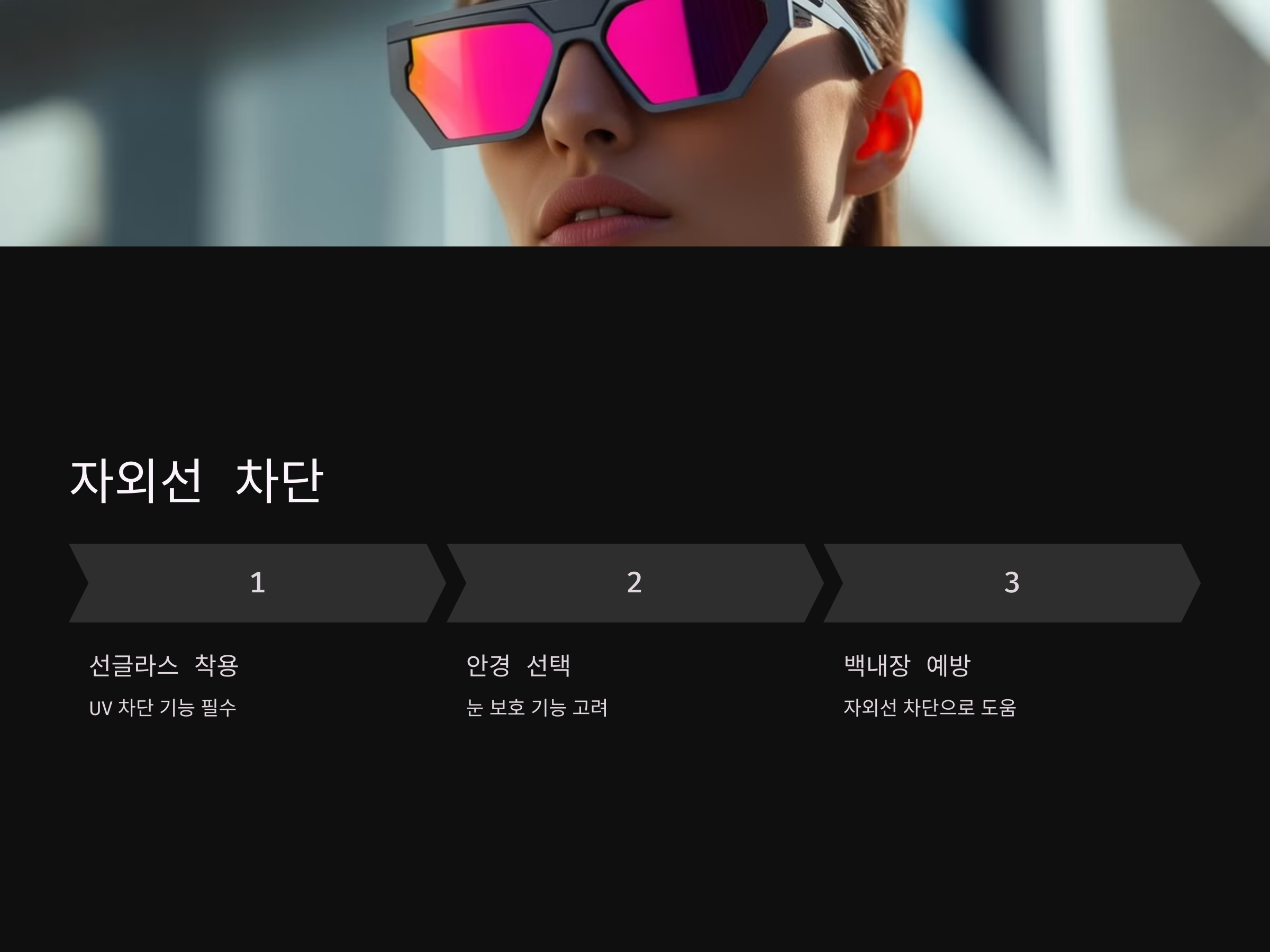 UV 차단이 가능한 선글라스를 선택하는 것이 중요하며, 눈을 보호하는 다양한 기능이 있는 안경을 사용하는 것이 좋습니다. 자외선 차단은 백내장과 같은 안과 질환을 예방하는 데에도 큰 도움이 됩니다.