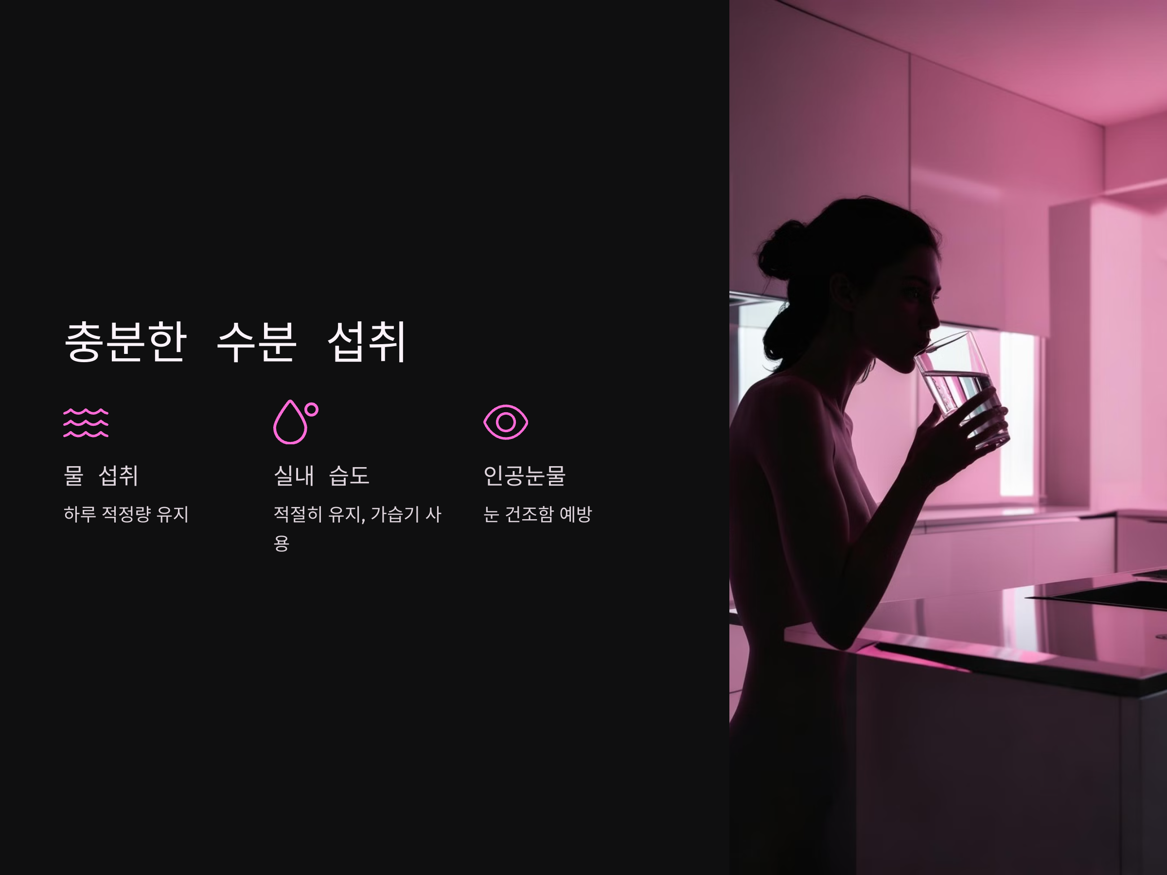 하루에 물을 적절히 섭취하는 것 외에도, 실내의 습도를 적절히 유지하는 것도 중요합니다. 실내 공기가 건조하면 눈이 더욱 쉽게 건조해지기 때문에 가습기를 사용하는 것이 도움이 될 수 있습니다. 또한, 인공눈물 등을 사용해 눈의 건조함을 예방할 수 있습니다.