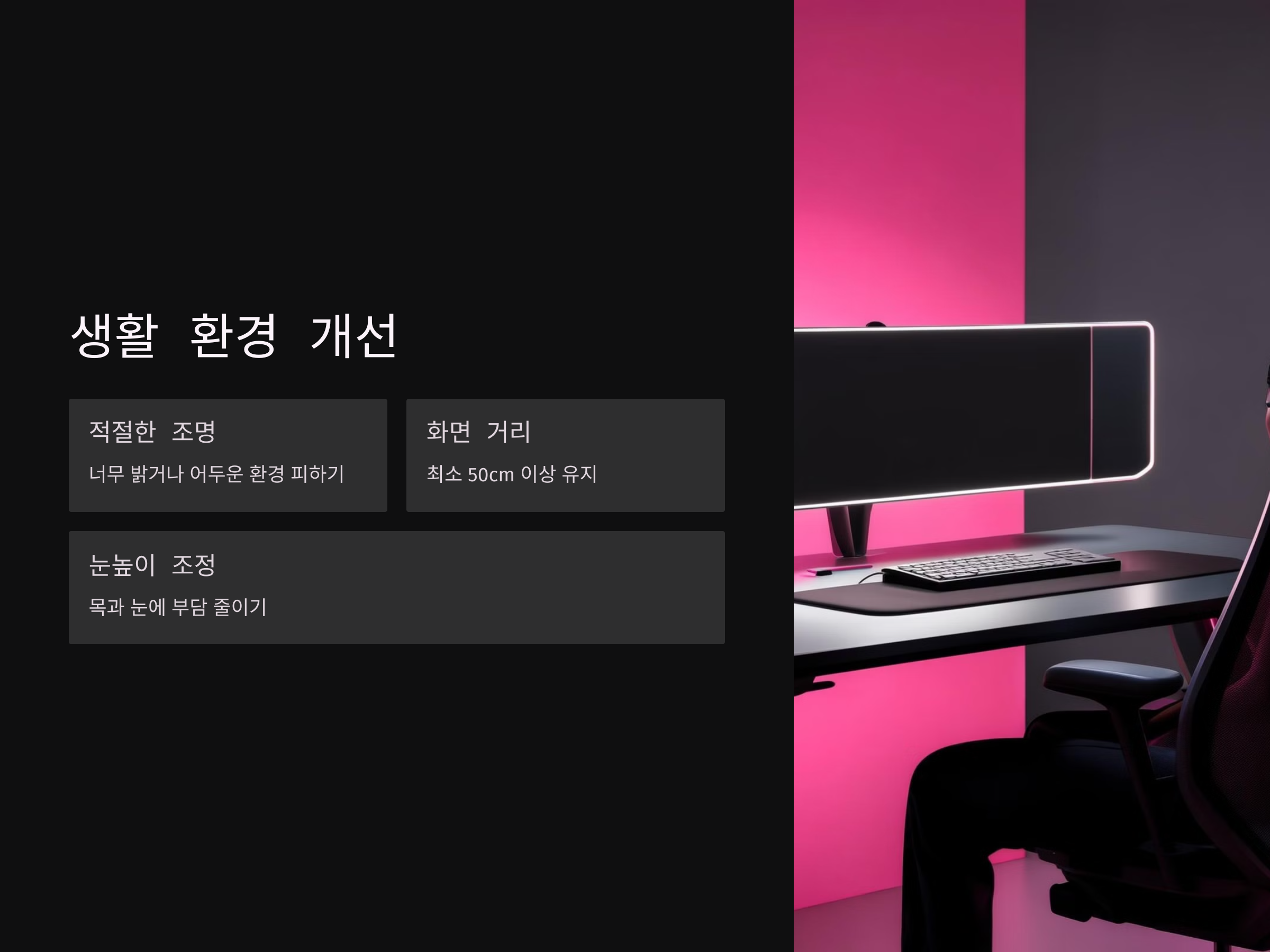 눈 건강을 지키기 위해서는 생활 환경이 매우 중요합니다. 예를 들어, 너무 밝거나 어두운 곳에서 오랜 시간 작업을 하지 않도록 해야 합니다. 또한, 눈을 보호할 수 있는 좋은 조명을 사용하고, 화면에서 적절한 거리를 유지하는 것이 좋습니다.