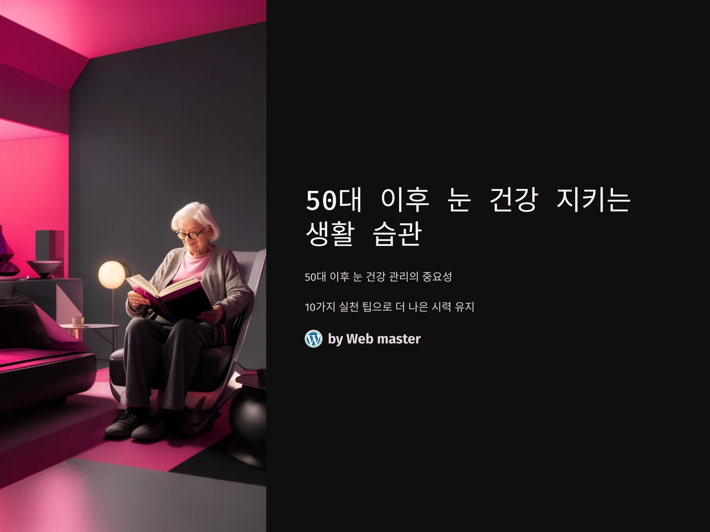 50대 이후 눈 건강을 지키는 것은 작은 노력으로 가능하며, 일상에서 쉽게 실천할 수 있는 방법들이 많습니다. 꾸준히 실천한다면 눈의 피로를 줄이고, 시력을 더욱 건강하게