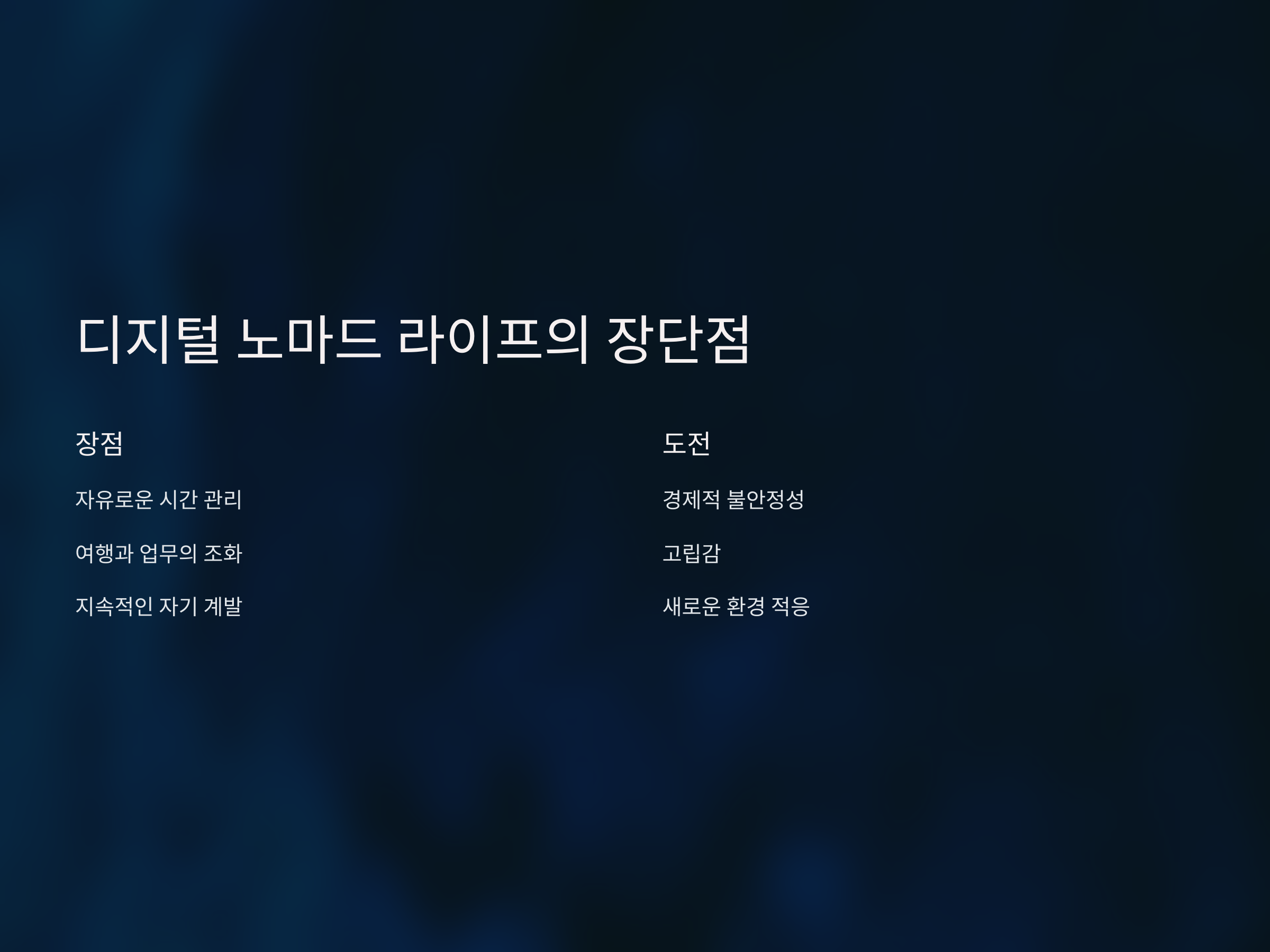 디지털 노마드로서 살아가는 삶은 많은 장점들을 가지고 있지만, 그만큼 도전적인 측면도 존재합니다. 50대 이후, 새로운 환경에서 살아가는 것은 때때로 불안감을 유발할 수 있습니다. 그러나 이 점을 잘 극복한다면, 매우 보람찬 삶을 살 수 있습니다.
