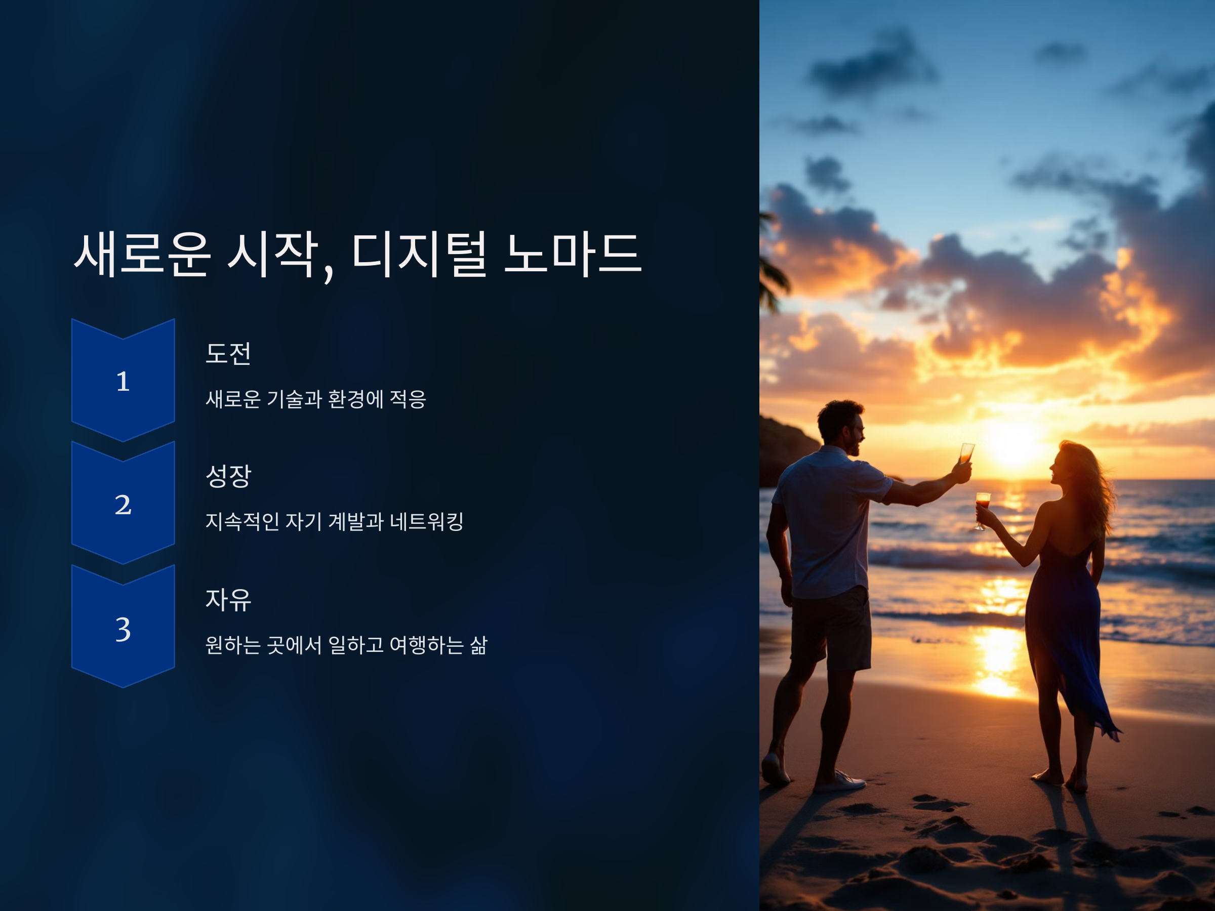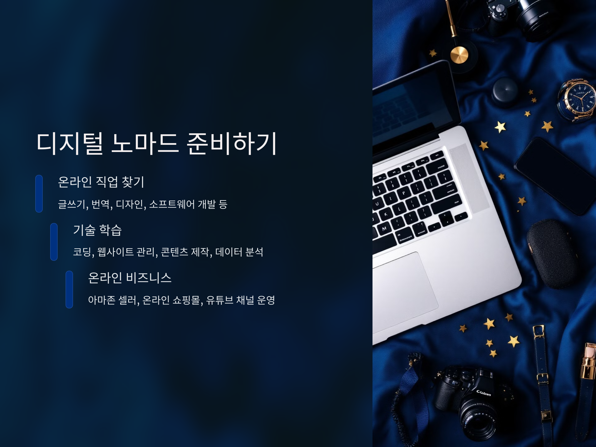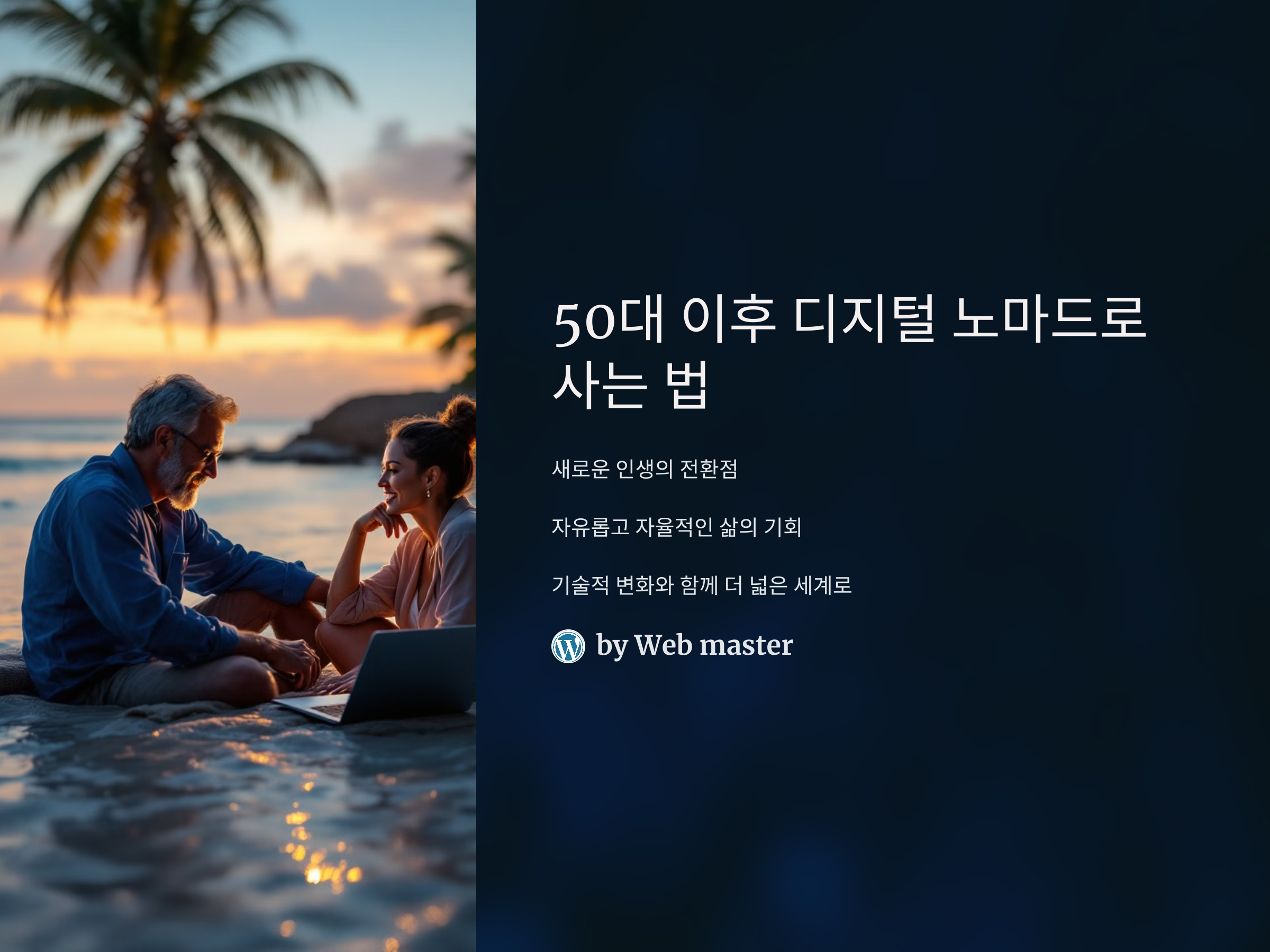 로 살아가는 삶은 50대 이후에도 충분히 실현 가능하고, 새로운 기회를 열어주는 여정입니다. 자신의 삶을 재정비하고, 새로운 목표를 향해 나아갈 준비가 되었다면, 디지털 노마드로서의 삶을 시작해 보세요. 이 길은 자유롭고 의미 있는 삶을 만들어줄 것입니다.