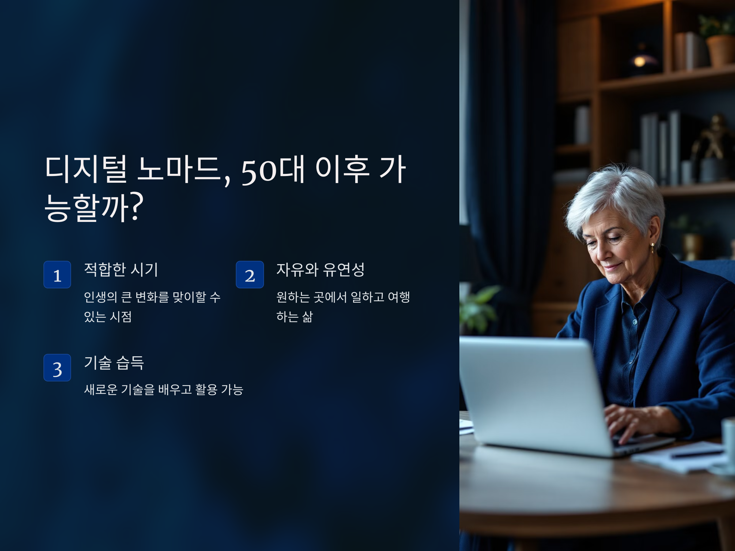 디지털 노마드는 그 중 하나로, 이를 통해 자신이 원하는 곳에서 자유롭게 일하고 여행하는 삶을 살 수 있게 됩니다. 직장을 떠난 후의 삶에서 가장 중요한 것은 '자유'와 '유연성'인데, 디지털 노마드는 이를 실현할 수 있는 좋은 방법입니다. 또한, 기술적인 측면에서 봤을 때, 50대 이후에도 충분히 새로운 기술을 배우고 활용할 수 있습니다.