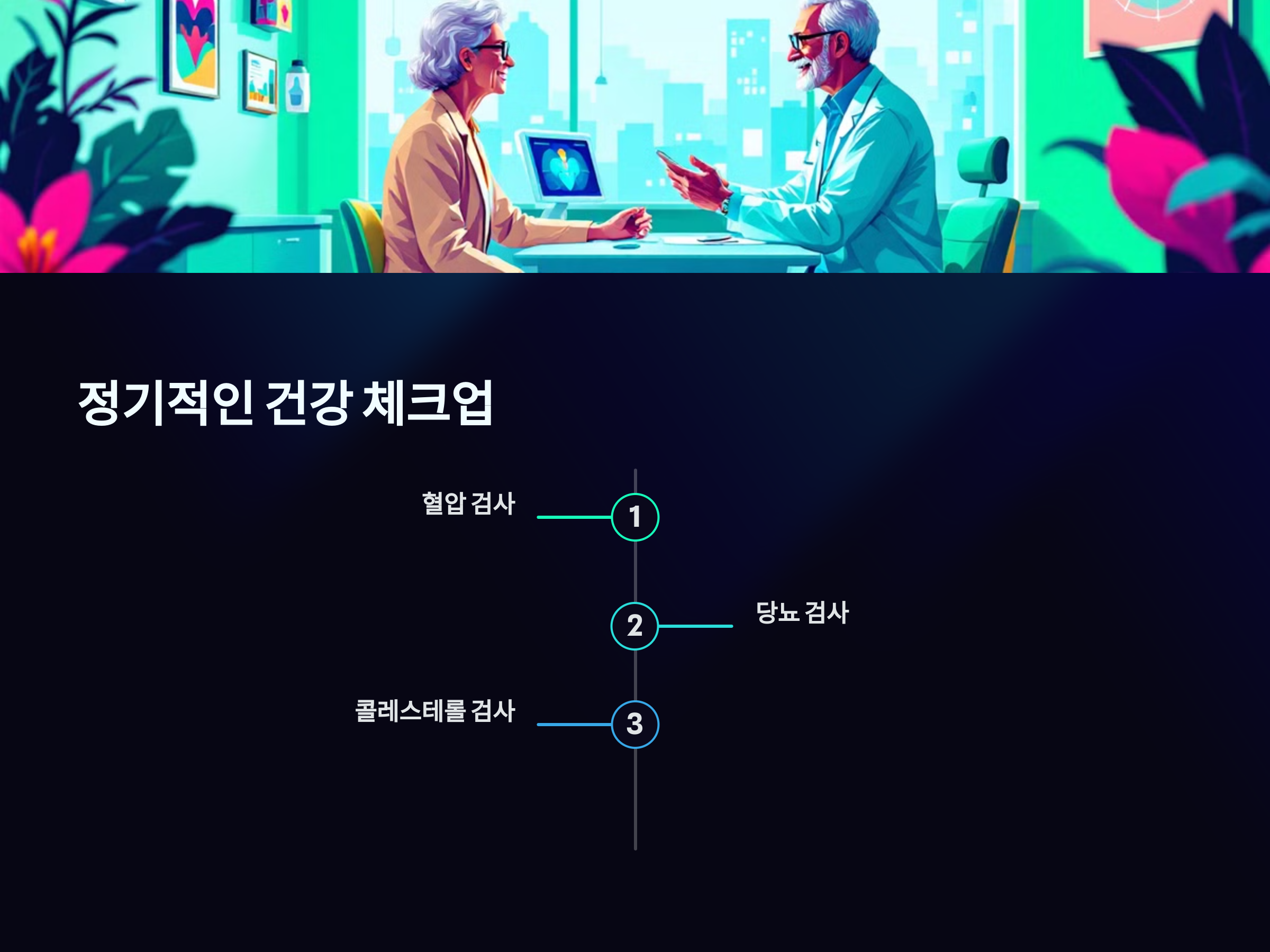 A: 정기적인 검진 항목은 기본적으로 혈압, 당뇨, 콜레스테롤 검사입니다. 필요한 검사는 나이에 맞춰 의사와 상담 후 결정하는 것이 좋습니다.
