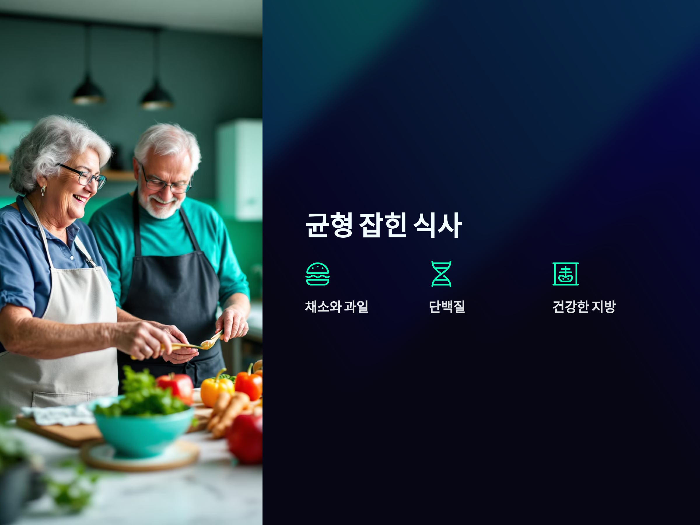 50대 이후에는 신체의 대사율이 떨어지기 때문에 음식의 섭취량과 영양소가 더욱 중요해집니다. 균형 잡힌 식사는 체중 관리뿐만 아니라, 심혈관 질환, 당뇨, 골다공증 등 다양한 질환 예방에도 필수적입니다. 배우자와 함께 건강한 식습관을 가지는 것은 매우 중요합니다.