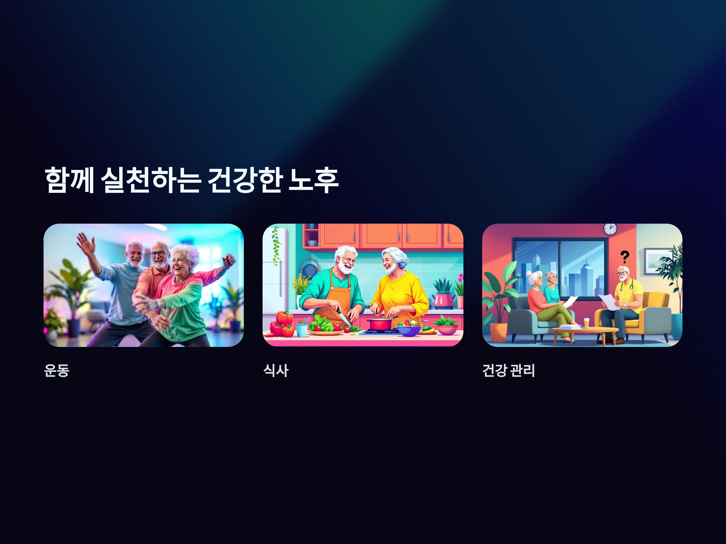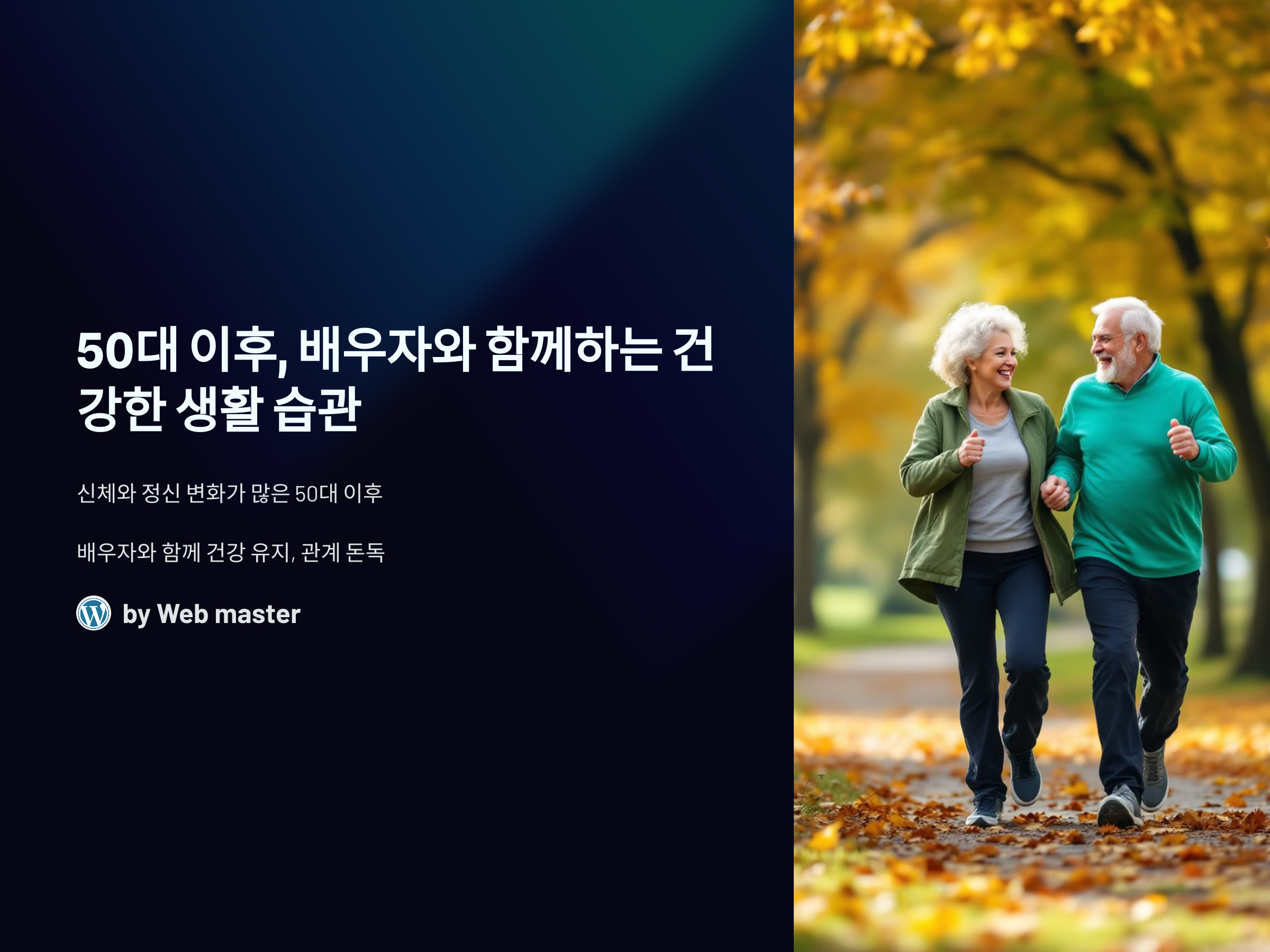 중요한 첫걸음입니다. 꾸준한 운동, 건강한 식습관, 충분한 수면, 스트레스 관리 등을 통해 더 행복하고 건강한 삶을 만들어가세요. 배우자와 함께라면 그 어느 때보다 더욱 즐겁고 의미 있는 삶을 살 수 있을 것입니다.