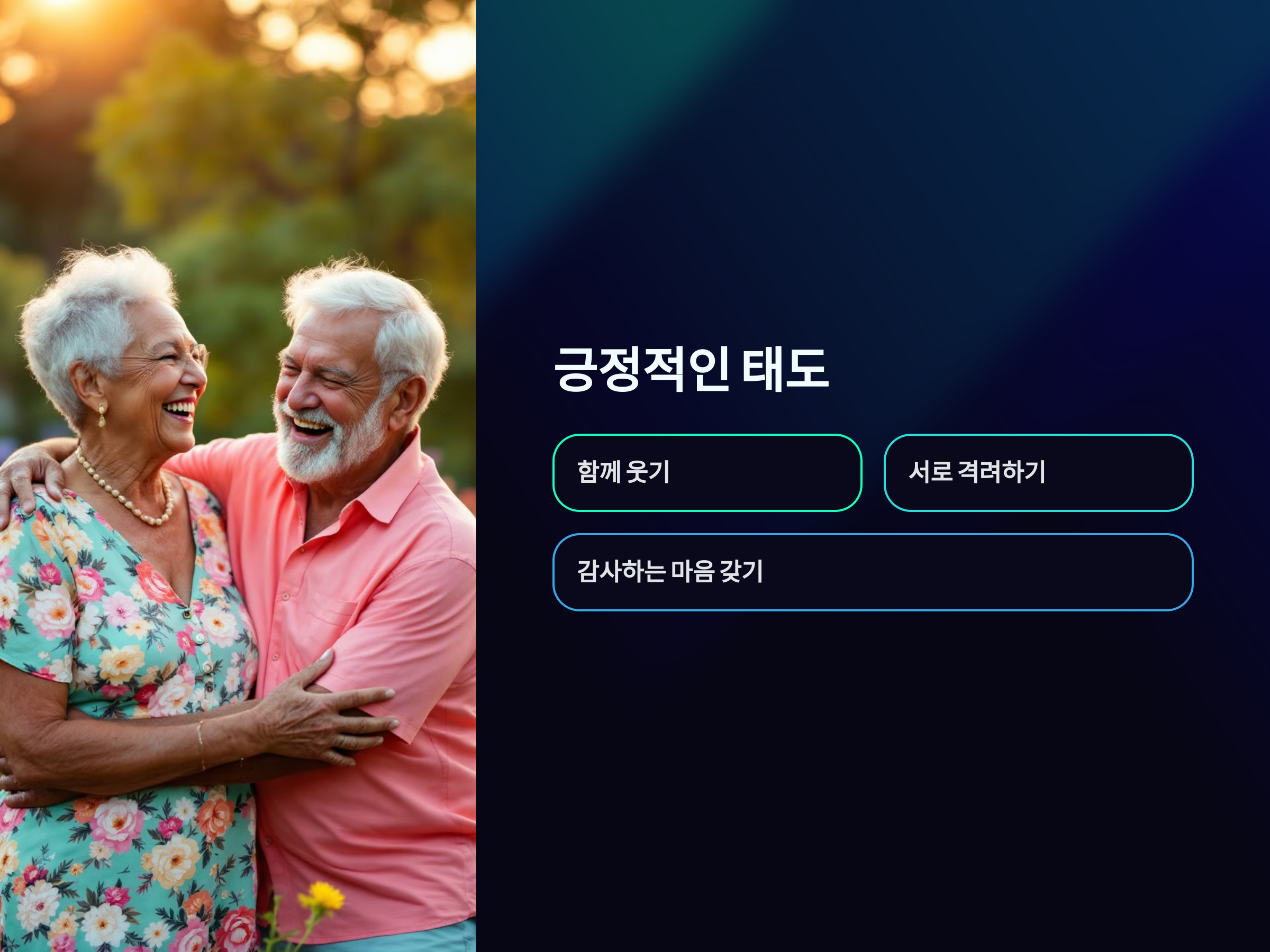 긍정적인 태도는 건강에 매우 중요한 영향을 미칩니다. 50대 이후에는 다양한 도전이 있지만, 긍정적인 마음가짐을 갖고 생활하면 건강도 좋아지고 행복한 삶을 살 수 있습니다. 배우자와 함께 긍정적인 태도를 유지하고, 서로를 격려하며 웃음을 나누는 것이 중요합니다.