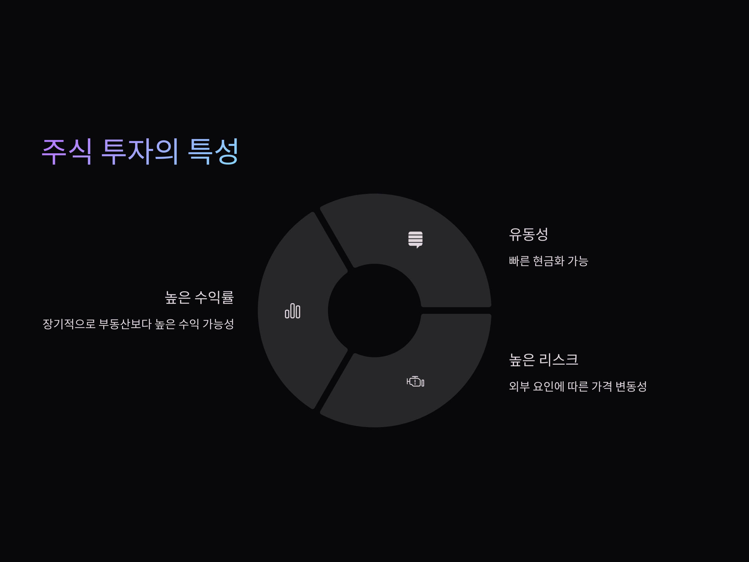 주식은 부동산에 비해 초기 투자금이 적고, 상대적으로 더 많은 수익을 올릴 수 있는 가능성을 제공합니다. 하지만 그만큼 리스크도 크기 때문에, 50대 이후에는 신중하게 접근해야 합니다. 주식 투자의 특징과 장단점을 살펴보겠습니다.