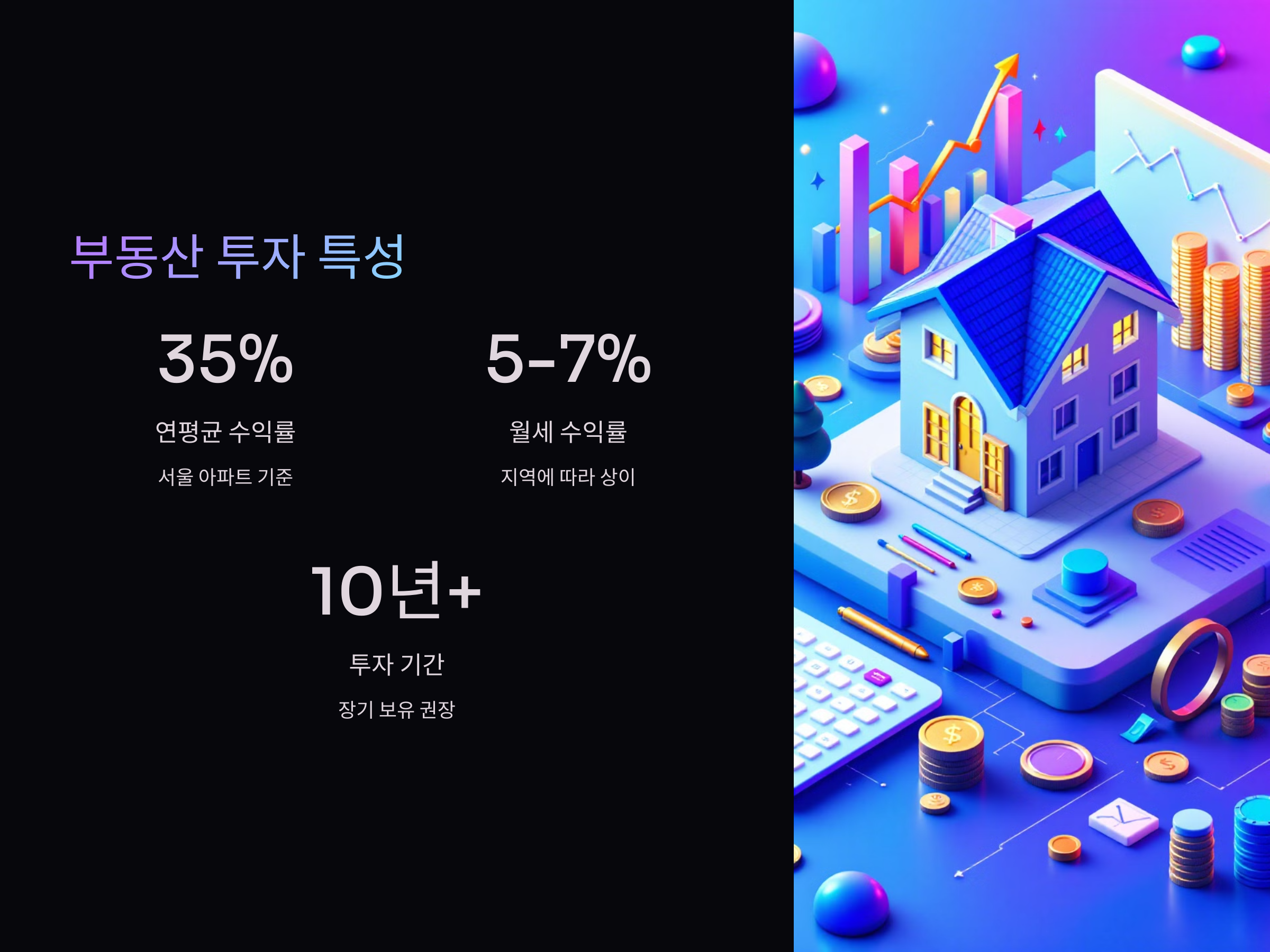 부동산은 상대적으로 더 안정적인 수익을 제공합니다. 주식은 단기적으로 큰 변동성을 보이기 때문에, 안전성을 중요시하는 투자자에게는 부동산이 더 적합할 수 있습니다.