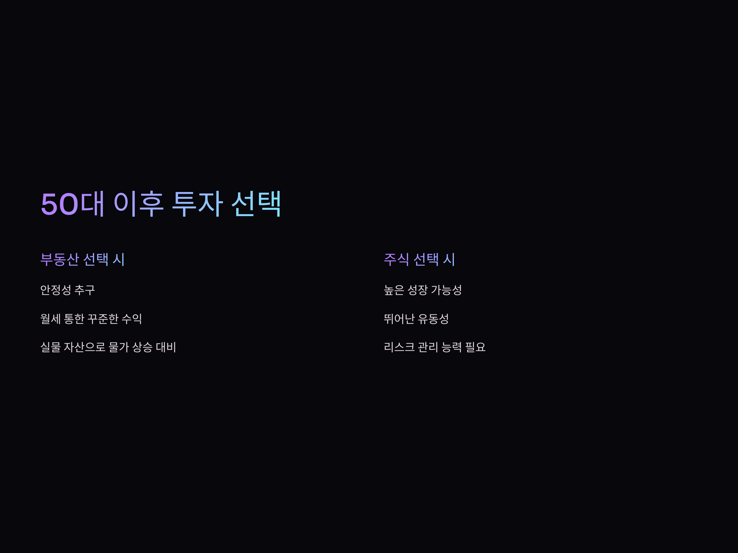 부동산은 장기적인 안정성을 제공하며, 월세를 통해 꾸준한 수익을 기대할 수 있습니다. 특히 은퇴 후 생활비에 도움이 되는 월세 수익은 부동산 투자에서 큰 장점으로 작용합니다. 또한 실물 자산에 투자하기 때문에, 물가 상승이나 경제 불황에 대비할 수 있습니다. 50대 이후에는 리스크가 적고 안전한 자산에 대한 선호가 커지므로, 부동산 투자가 더 유리할 수 있습니다.