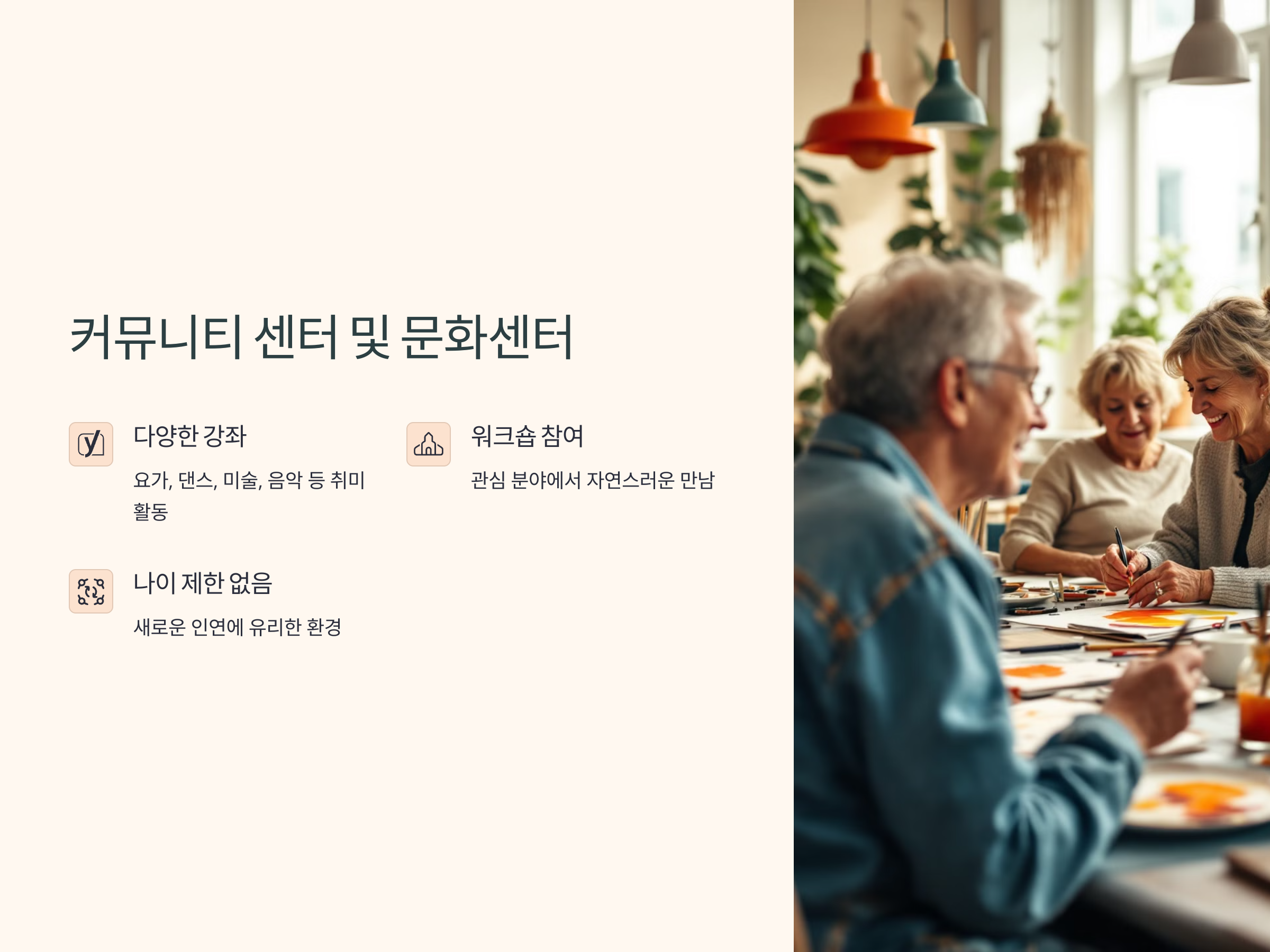 많은 도시에는 50대 이상을 위한 다양한 프로그램을 제공하는 커뮤니티 센터와 문화센터가 있습니다. 이러한 장소에서는 다양한 강좌와 활동이 진행되므로, 자신이 관심 있는 분야의 클래스를 듣거나 워크숍에 참여할 수 있습니다. 예를 들어, 요가, 댄스, 미술, 음악 등 다양한 취미 활동을 통해 자연스럽게 사람들을 만날 수 있습니다. 이런 활동들은 나이와 상관없이 즐길 수 있기 때문에 새로운 인연을 만드는 데 유리한 환경을 제공합니다.