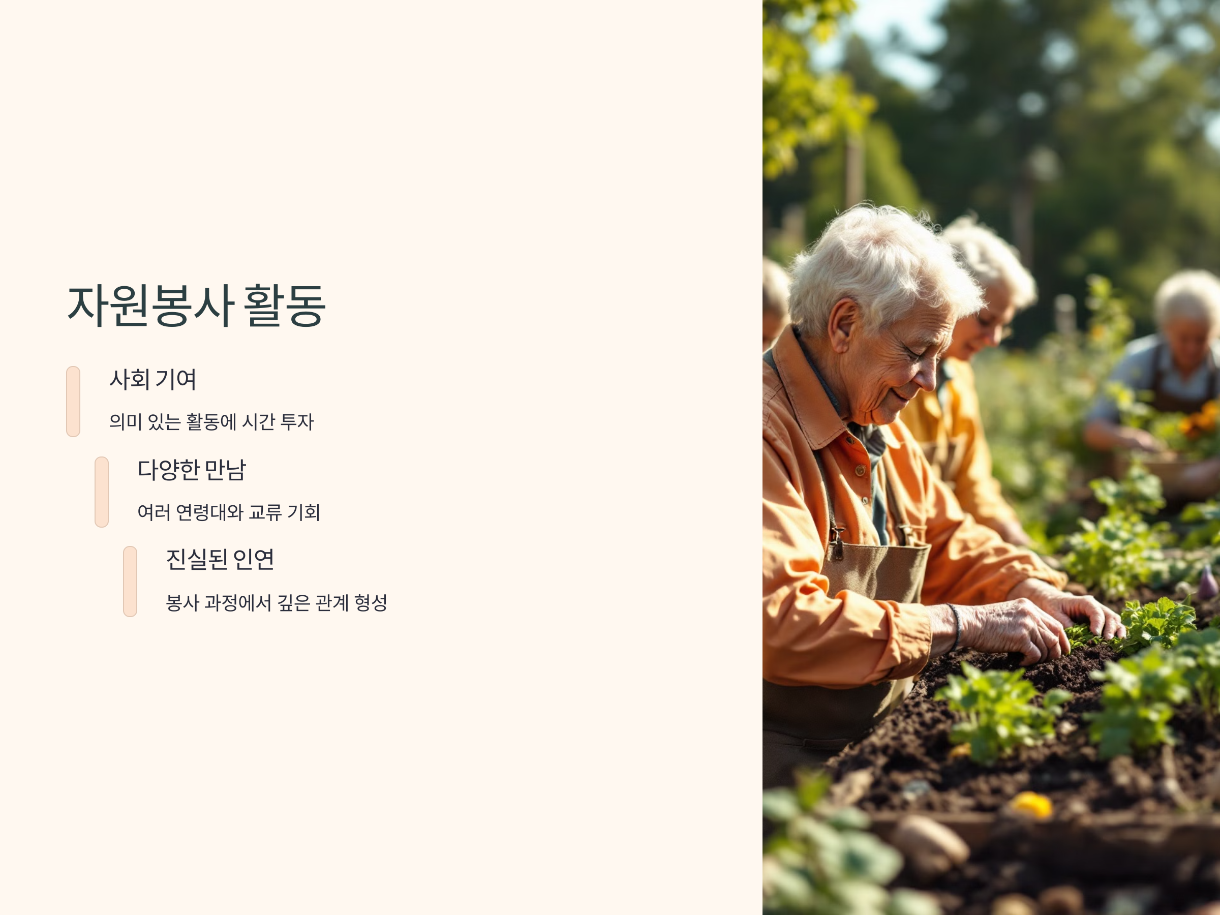 자원봉사 활동은 다른 사람들과의 만남뿐만 아니라 사회에 기여할 수 있는 기회를 제공합니다. 50대 이후에는 시간이 여유로운 경우가 많고, 이 시간을 의미 있는 활동에 사용하는 것이 중요합니다. 자원봉사는 다양한 사람들과 만나고, 도움을 주고받으며 관계를 형성할 수 있는 좋은 기회를 제공합니다. 또한, 봉사 활동에 참여하면서 함께 활동하는 사람들과의 관계는 깊고 진실된 인연을 맺을 수 있습니다.