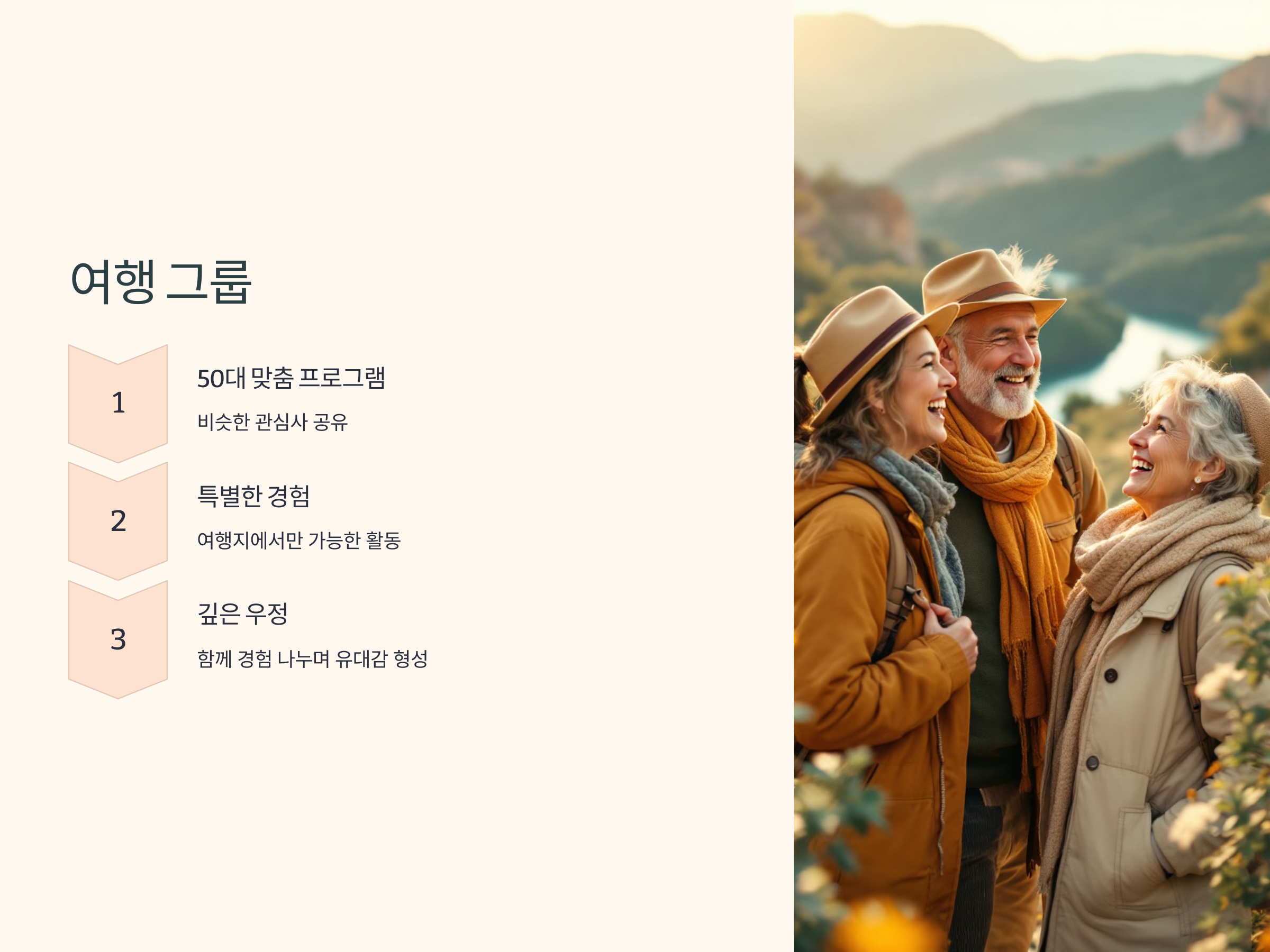 여행은 새로운 사람들을 만날 수 있는 기회를 많이 제공합니다. 특히, 여행 그룹에 참여하면 비슷한 관심사를 가진 사람들과 자연스럽게 친해질 수 있습니다. 많은 여행사에서는 50대 이상을 대상으로 하는 여행 프로그램을 운영하고 있습니다. 이러한 프로그램은 여행지에서만 만날 수 있는 특별한 경험을 제공하며, 여행 중 만나는 사람들과의 인연은 깊은 우정을 쌓을 수 있는 기회를 제공합니다. 함께 여행을 다니며 대화하고, 새로운 경험을 나누는 과정에서 강한 유대감을 형성할 수 있습니다.
