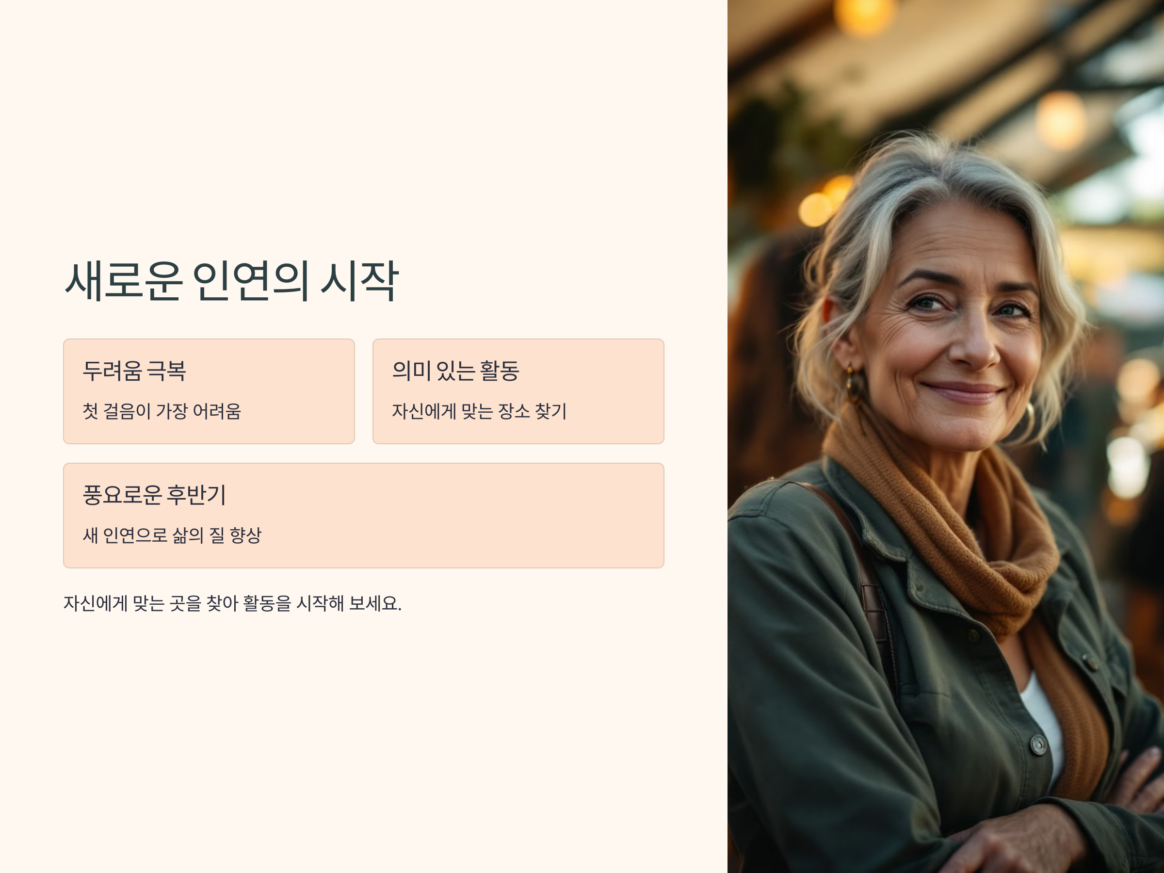50대 이후 새로운 사람을 만날 수 있는 장소는 다양하지만, 중요한 것은 자신에게 맞는 장소와 활동을 선택하는 것입니다. 관심사를 공유하는 사람들과의 만남은 더 깊은 관계로 이어질 가능성이 높기 때문입니다. 그렇다면 어떤 장소에서 새로운 인연을 만들 수 있을까요?