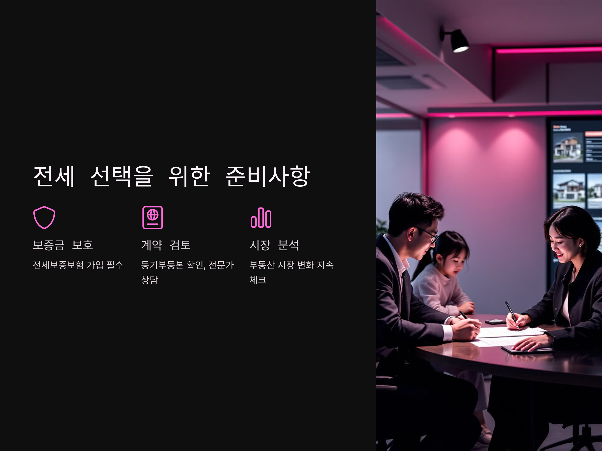 전세를 선택할 때는 몇 가지 주의할 사항이 있습니다. 첫째, 전세보증금을 안전하게 보호할 수 있는 계약을 맺어야 합니다. 전세보증보험에 가입하면 전세금 반환을 보장받을 수 있어 보다 안전한 거래가 가능합니다.