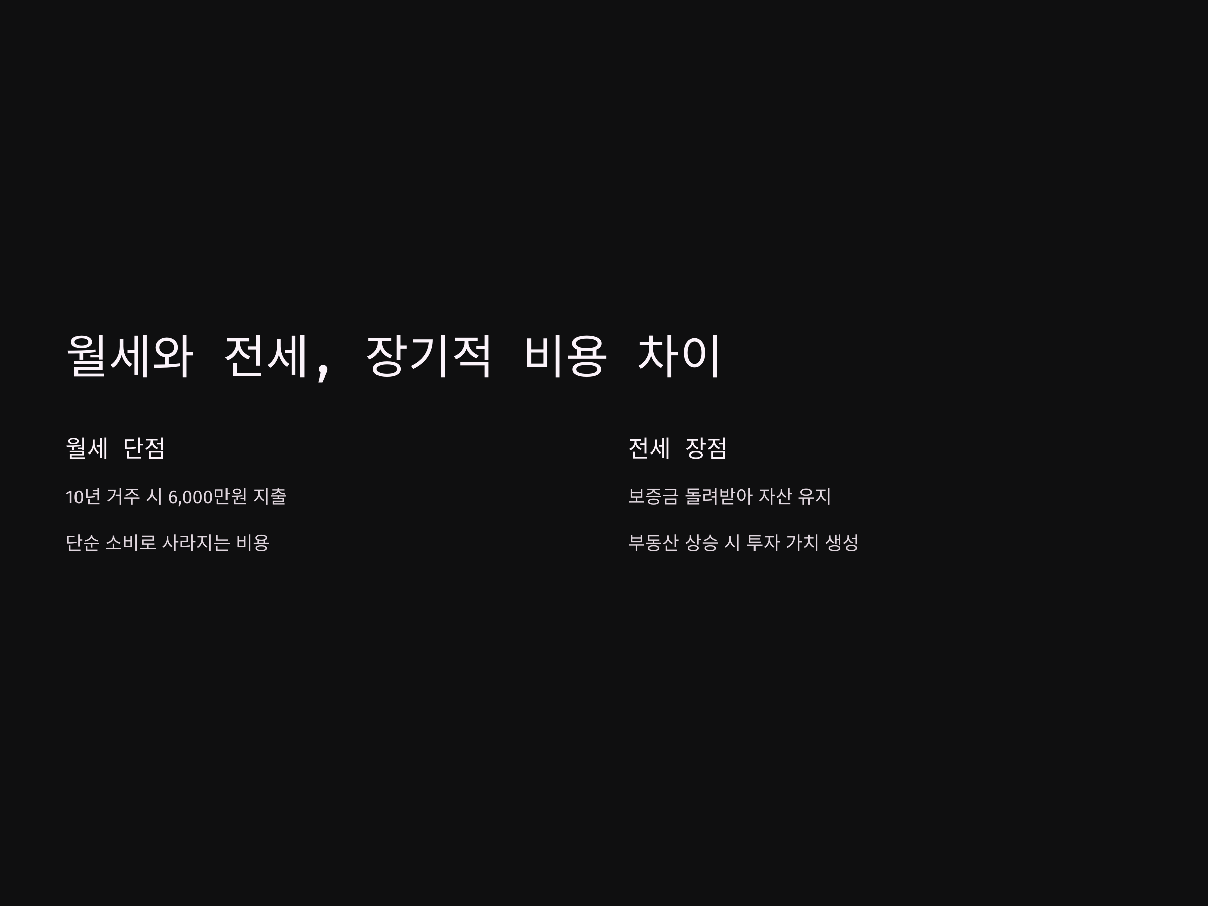 단기적으로 보면 월세는 큰 금액을 준비할 필요 없이 매달 일정한 금액을 내기만 하면 되므로 부담이 덜해 보입니다. 하지만 장기적으로 보면 상황이 달라집니다. 예를 들어, 보증금 1억 원에 월세 50만 원짜리 집에서 10년 동안 거주한다고 가정하면 총 6,000만 원을 월세로 지출하게 됩니다. 반면, 전세로 거주하면 보증금을 돌려받을 수 있어 자산을 유지할 수 있습니다.