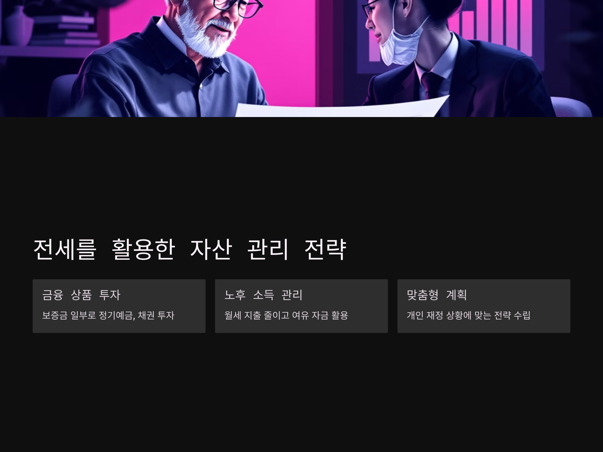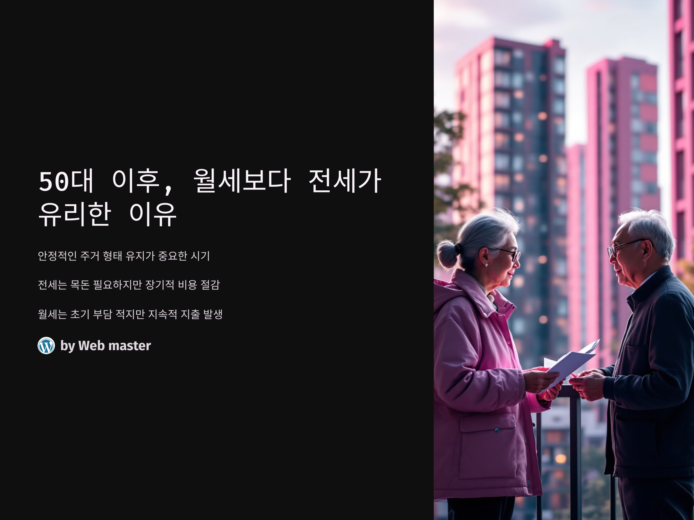 50대 이후에는 재정적인 안정성과 주거 비용 절감이 무엇보다 중요합니다. 월세는 지속적으로 비용이 발생하는 반면, 전세는 초기 비용이 크지만 장기적으로 재정적인 안정성을 확보할 수 있는 방법입니다. 특히, 은퇴를 앞둔 시기에는 주거 비용을 고정하고, 여유 자금을 활용하는 전략이 필요합니다.