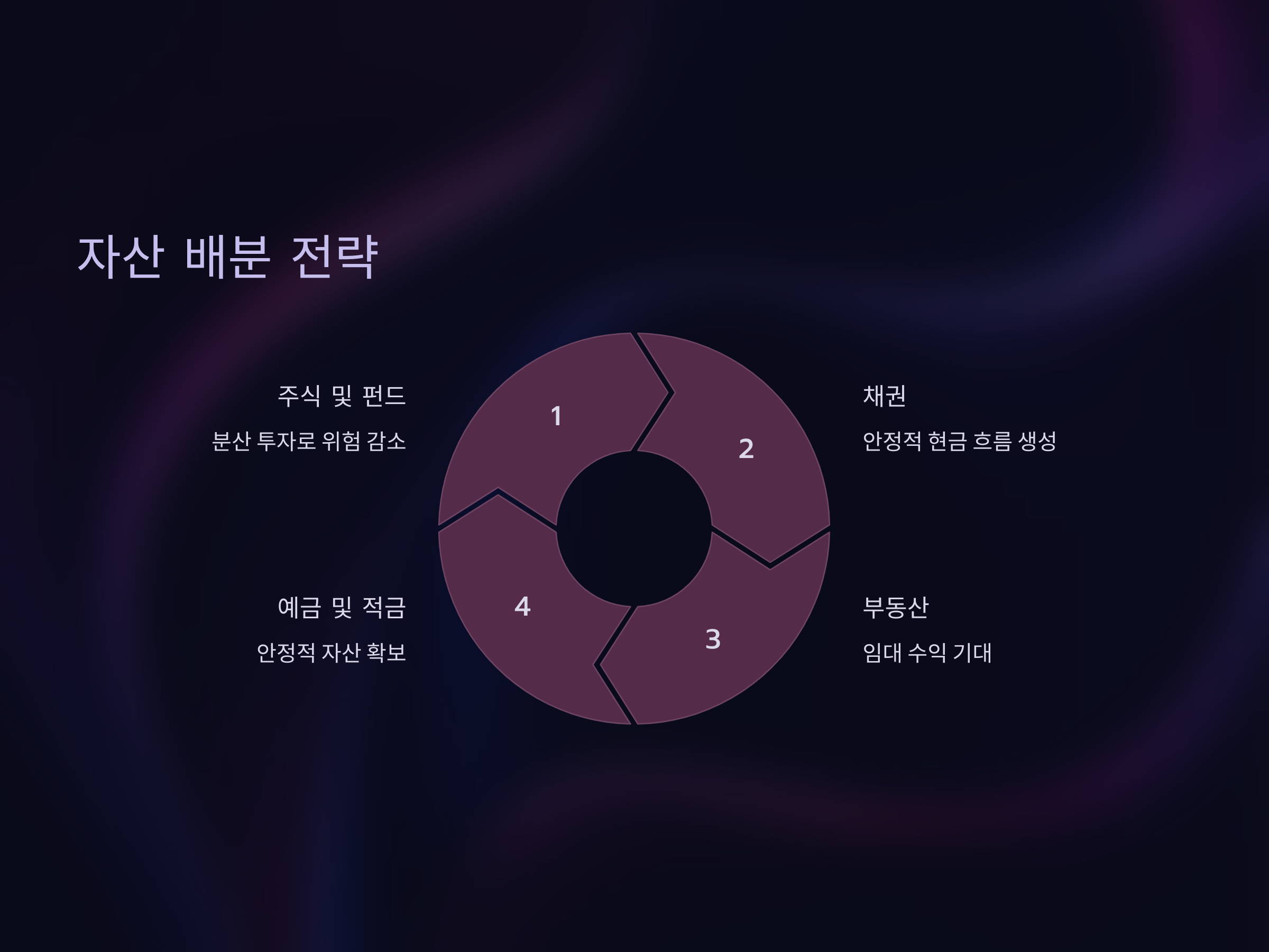 50대 이후에는 자산 배분 전략이 매우 중요합니다. 특히, 위험을 분산시키는 것이 핵심입니다. 자산을 다양한 분야에 분배함으로써 리스크를 줄이고, 안정적인 수익을 추구할 수 있습니다. 보통은 자산의 대부분을 안정적인 자산에 배치하고, 일정 비율을 위험 자산에 투자하는 방식으로 배분합니다.
