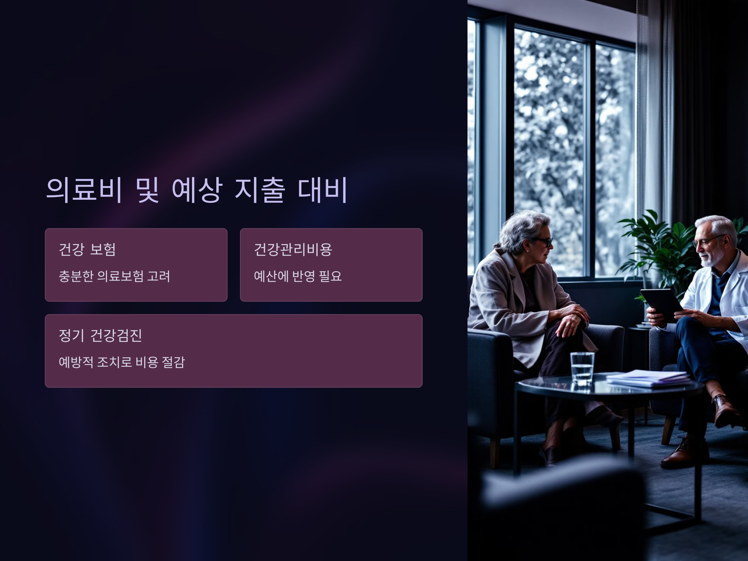 50대 이후에는 건강에 대한 걱정이 많아집니다. 의료비 지출이 증가할 수 있기 때문에 이에 대한 준비도 필요합니다. 은퇴 후에도 건강 보험 및 의료보험을 충분히 고려하고, 만약을 대비해 건강관리비용을 예산에 반영해야 합니다.