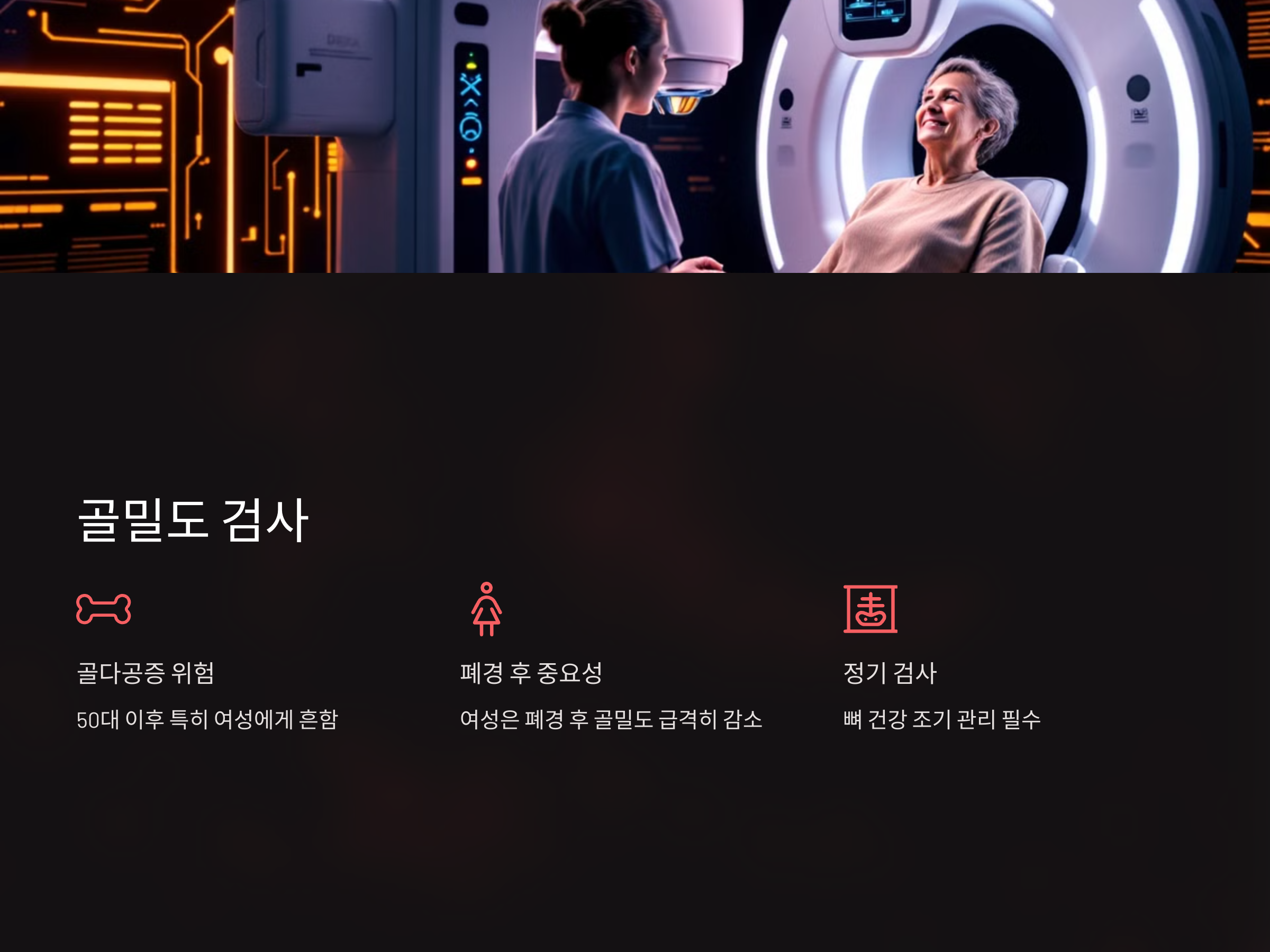 골다공증은 50대 이후 특히 여성에게 흔한 질환입니다. 골밀도 검사를 통해 골다공증을 조기에 발견하고, 뼈 건강을 관리할 수 있습니다. 여성의 경우 폐경 후 골밀도가 급격히 낮아지기 때문에 더욱 중요합니다.