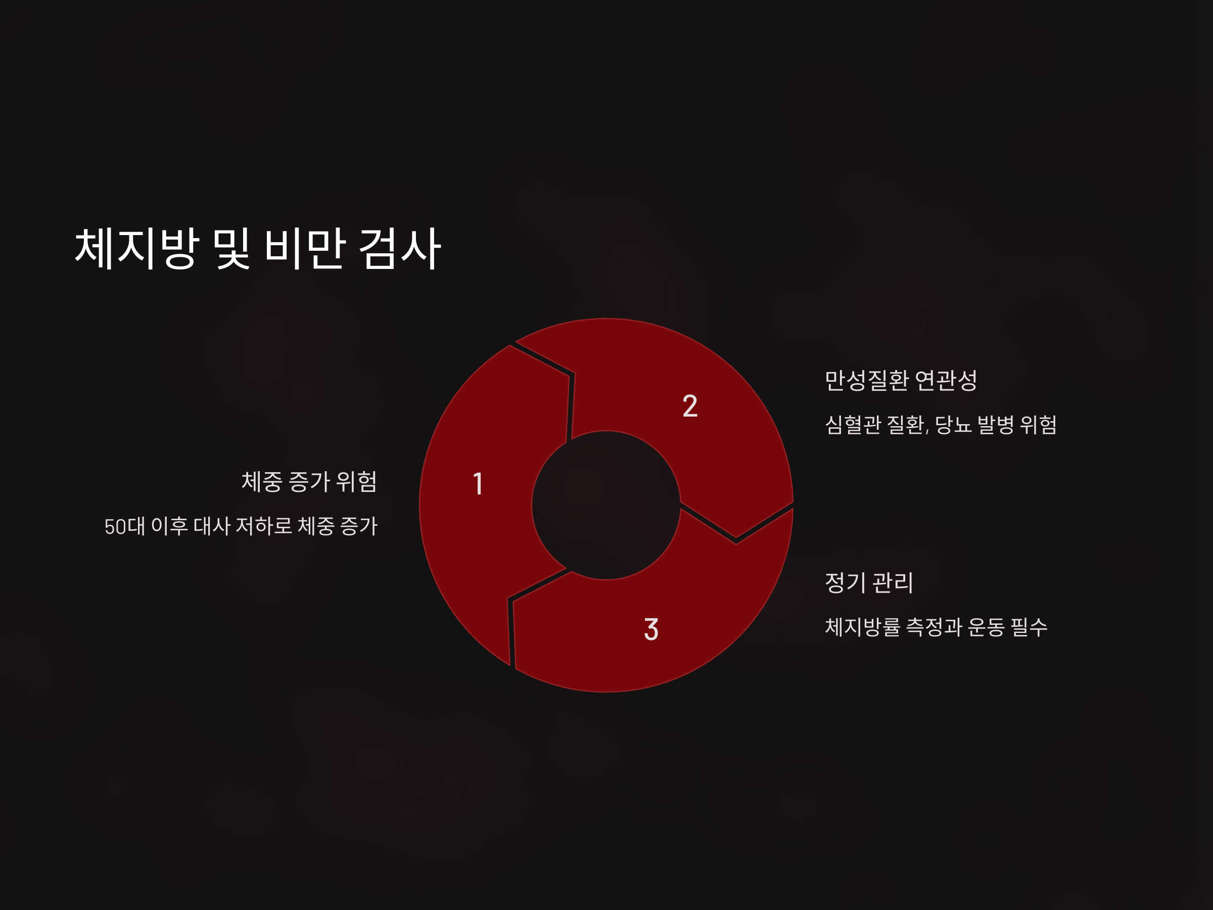 50대 이후에는 체중 증가가 문제를 일으킬 수 있습니다. 과도한 체지방은 심혈관 질환, 당뇨 등의 발병을 초래할 수 있기 때문에 체지방률을 측정하고, 이를 관리하는 것이 중요합니다. 정기적인 체중 관리와 운동은 필수입니다.