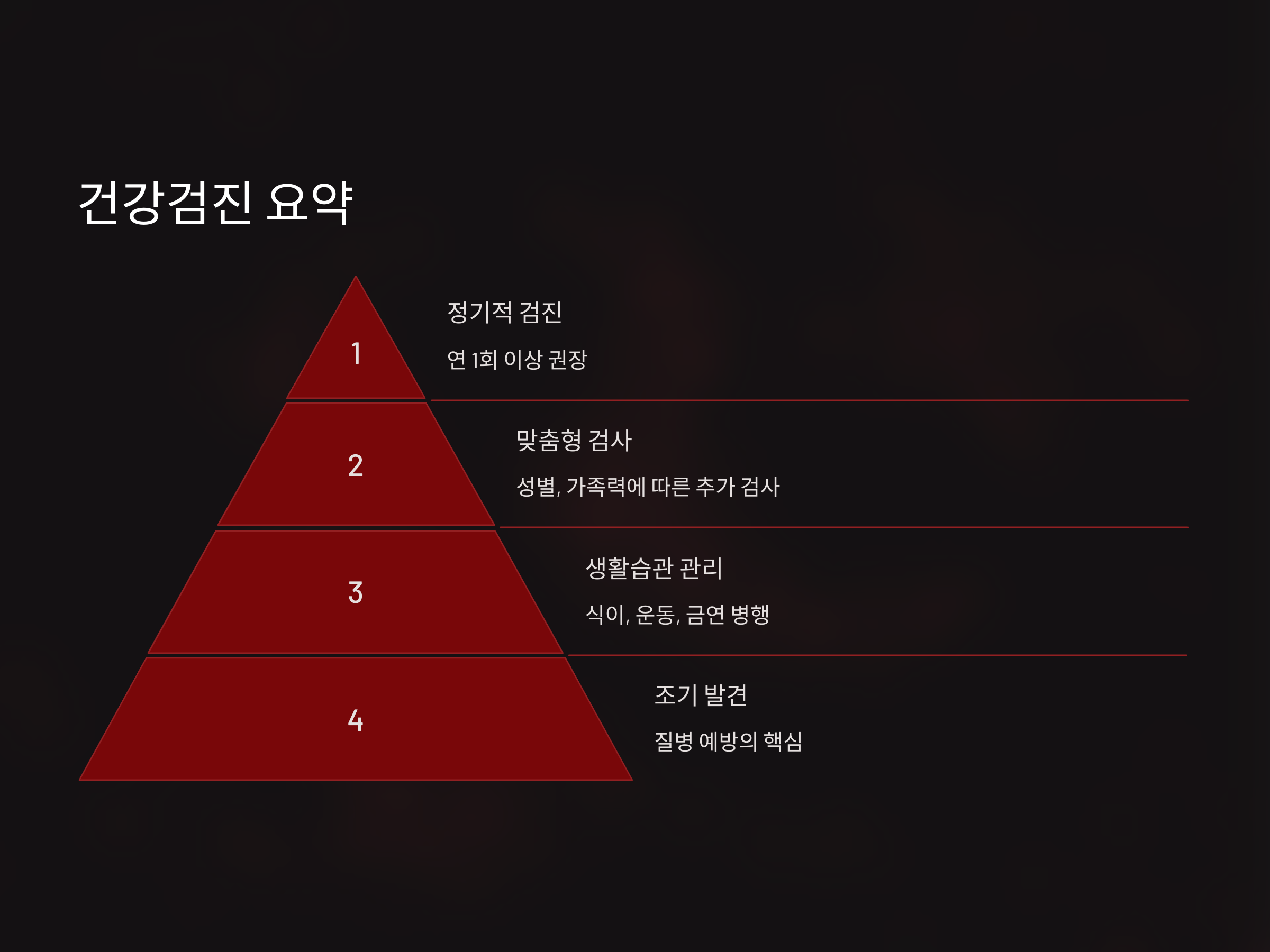 50대는 신체 기능의 변화가 본격적으로 나타나는 시기입니다. 대사나 호르몬 변화, 장기별 기능 저하 등으로 인해 건강 상태에 주의를 기울여야 합니다. 건강검진은 이러한 변화들을 미리 파악하고, 질병을 조기에 발견하여 치료를 시작할 수 있는 중요한 기회입니다. 50대 이후에는 특히 심혈관 질환, 당뇨, 암 등 각종 질병의 발병률이 높아지므로 정기적인 검진을 통해 예방하는 것이 중요합니다.