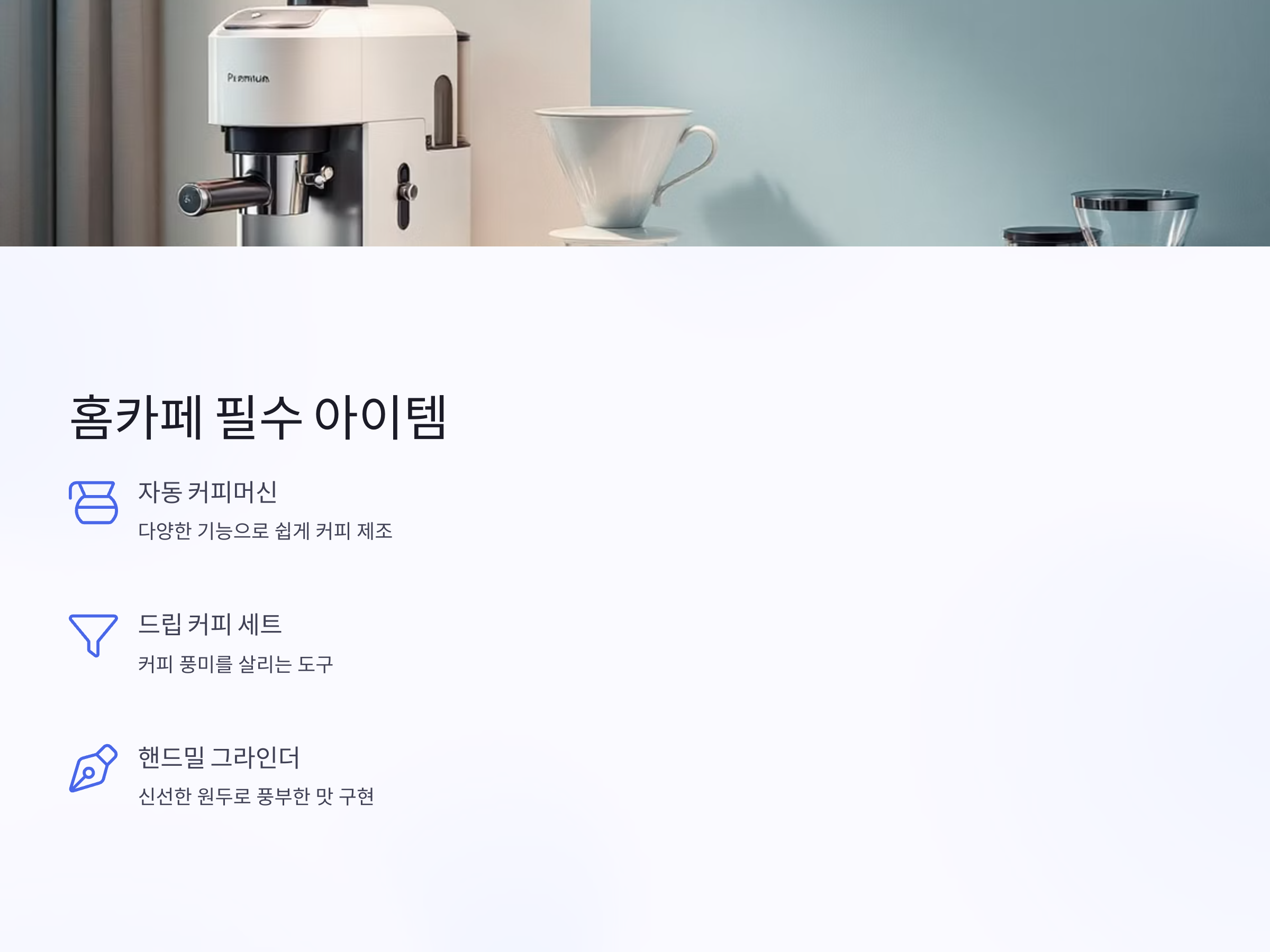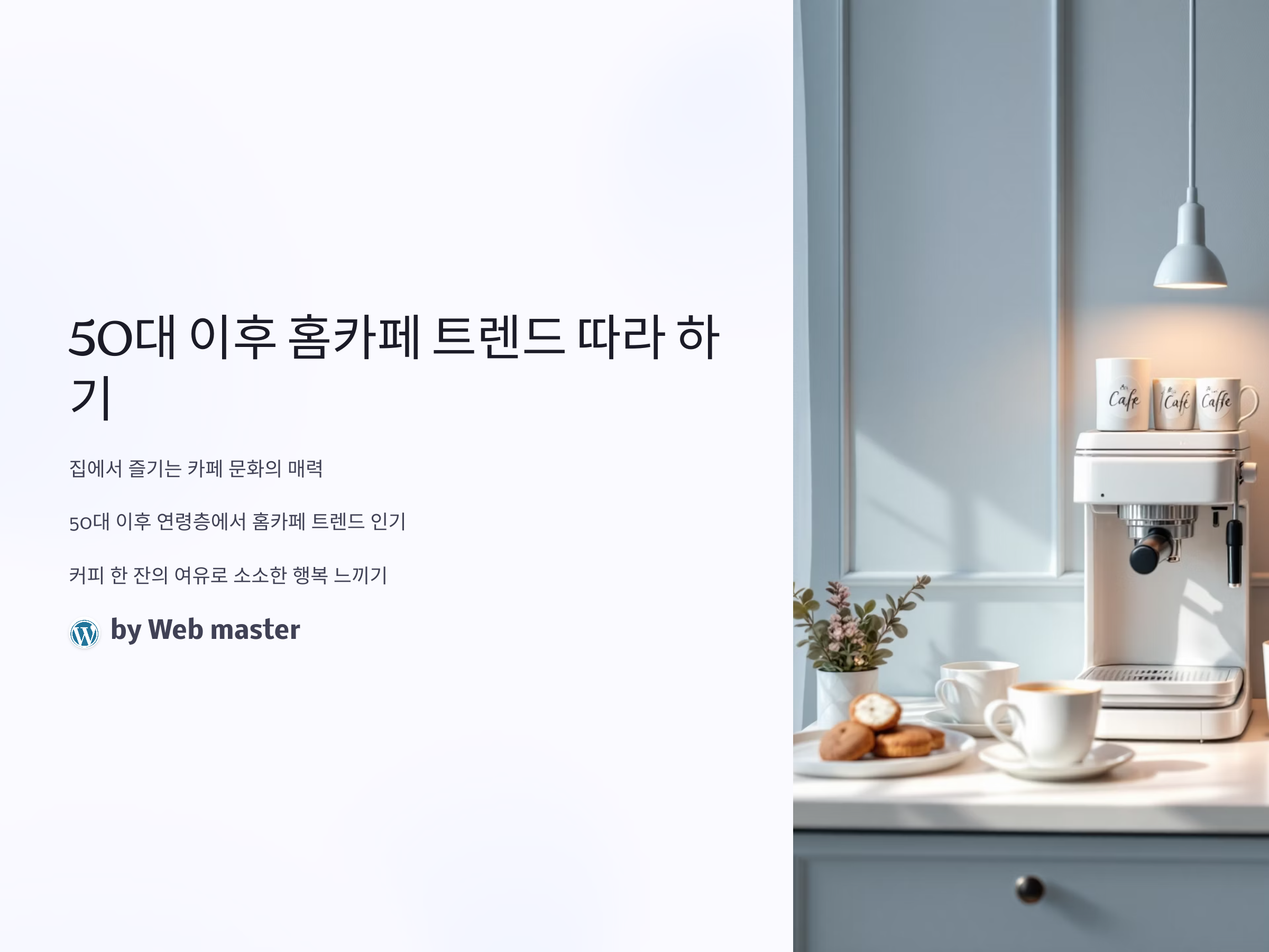 50대 이후에도 홈카페 트렌드는 단순히 커피를 마시는 행위 그 이상으로, 자신만의 커피 문화를 즐기고, 여유로운 삶을 만들어가는 방법이 됩니다. 집에서 커피를 내리며 편안한 시간을 보내는 것은 스트레스를 해소하고, 일상에 작은 즐거움을 선사하는 좋은 방법입니다. 홈카페를 즐기면서 자신만의 커피 스타일을 만들어가며, 카페처럼 특별한 분위기를 집에서도 경험해 보세요.