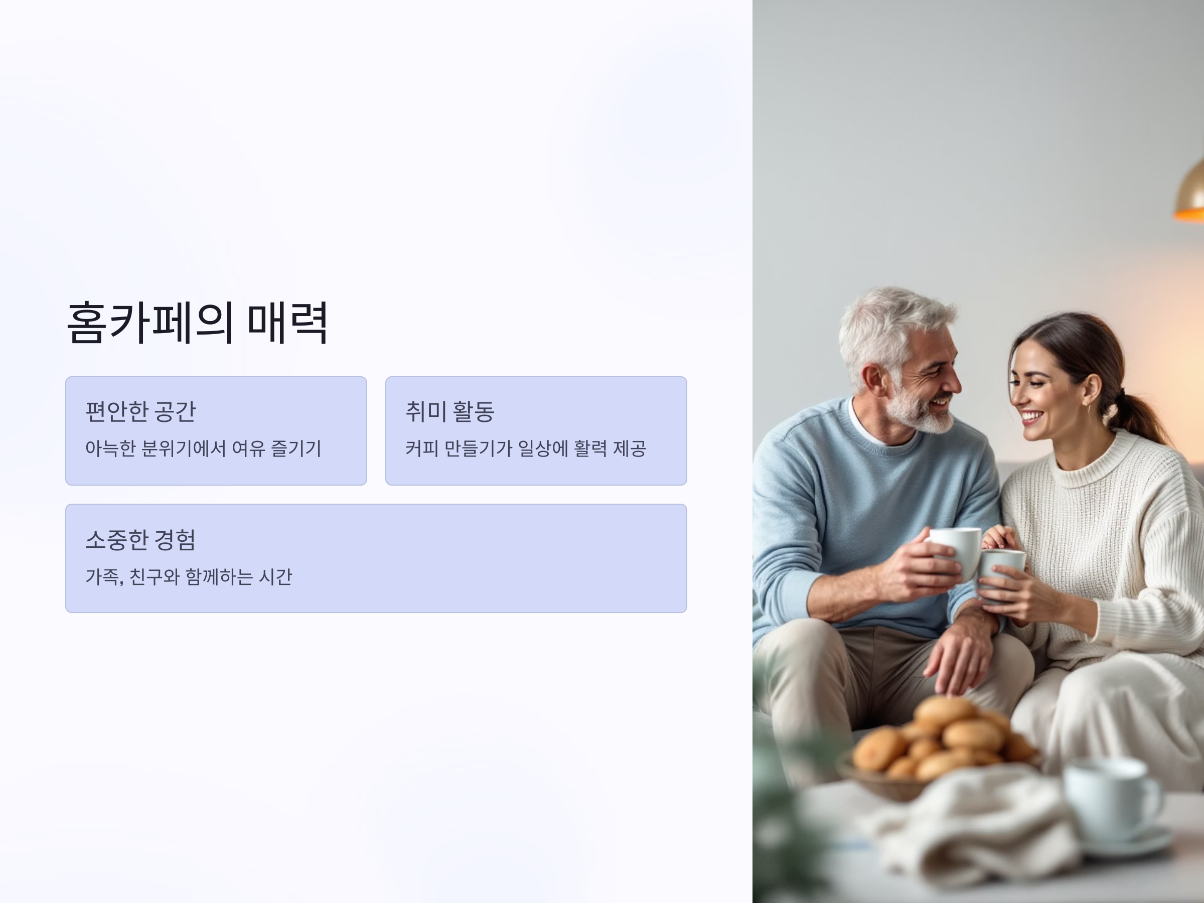 50대 이후 홈카페의 가장 큰 매력은 편안한 공간에서 여유를 즐기며 시간을 보낼 수 있다는 점입니다. 카페를 외출할 필요 없이 집에서 자신만의 커피를 만들고, 아늑한 분위기에서 편안한 시간을 보낼 수 있는 점은 매우 큰 장점입니다. 또한, 커피를 만들고 마시는 과정 자체가 하나의 취미가 될 수 있어, 일상에 활력을 불어넣는 역할을 합니다.