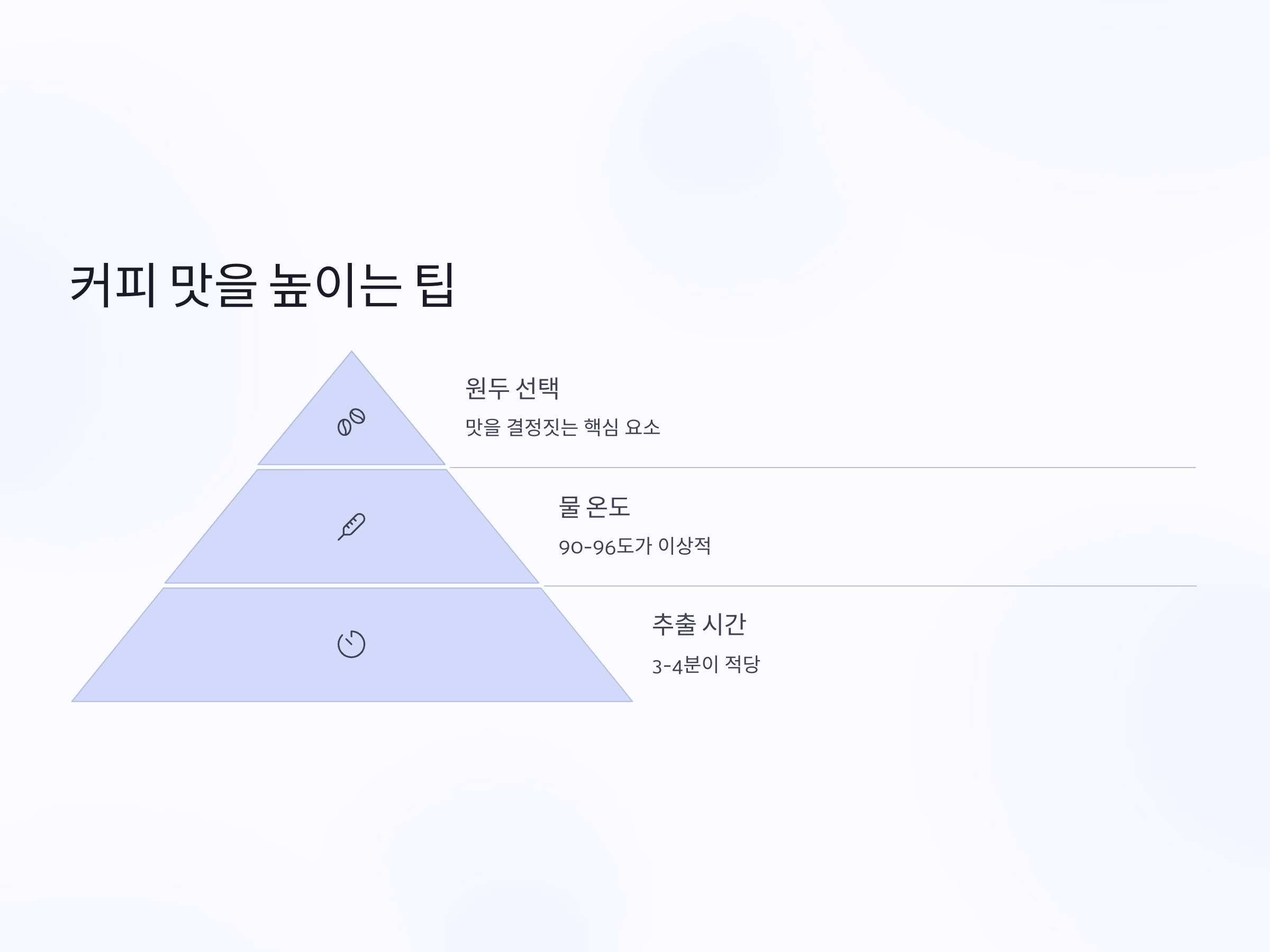 두 번째 팁은 물의 온도입니다. 커피를 내릴 때 물의 온도는 매우 중요합니다. 물이 너무 뜨겁거나 차가우면 커피의 맛이 제대로 나지 않습니다. 적절한 온도는 90도에서 96도 정도입니다. 이 온도를 잘 맞추어 커피를 내리면 커피 본연의 풍미를 최대한 느낄 수 있습니다.