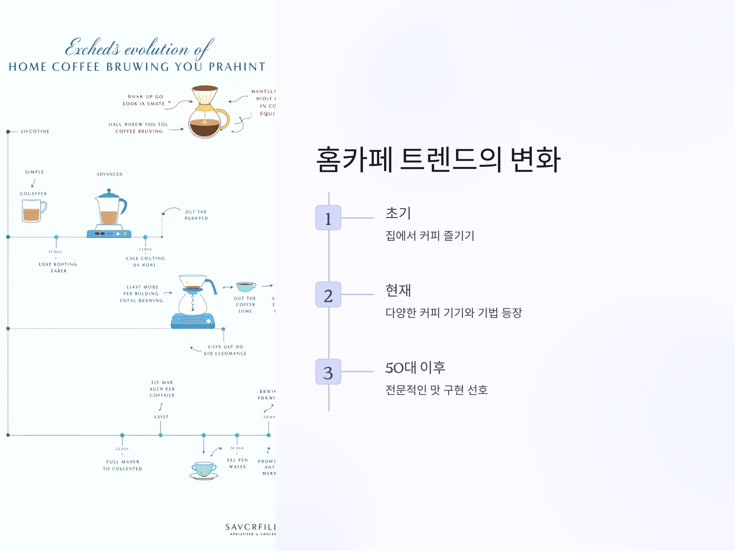 홈카페 트렌드는 꾸준히 변화해왔습니다. 초기에는 집에서 커피를 즐기는 것만으로도 큰 변화였지만, 이제는 다양한 커피 기기와 기법이 등장하면서 트렌드가 다채로워졌습니다. 50대 이후의 세대는 예전보다 커피를 더 많이 즐기며, 카페처럼 전문적인 맛을 집에서 구현하려는 경향이 강해졌습니다. 50대 이상은 바쁜 일상 속에서 커피 한 잔으로 소소한 행복을 느끼고, 여유로운 시간을 보내고 싶어 합니다.