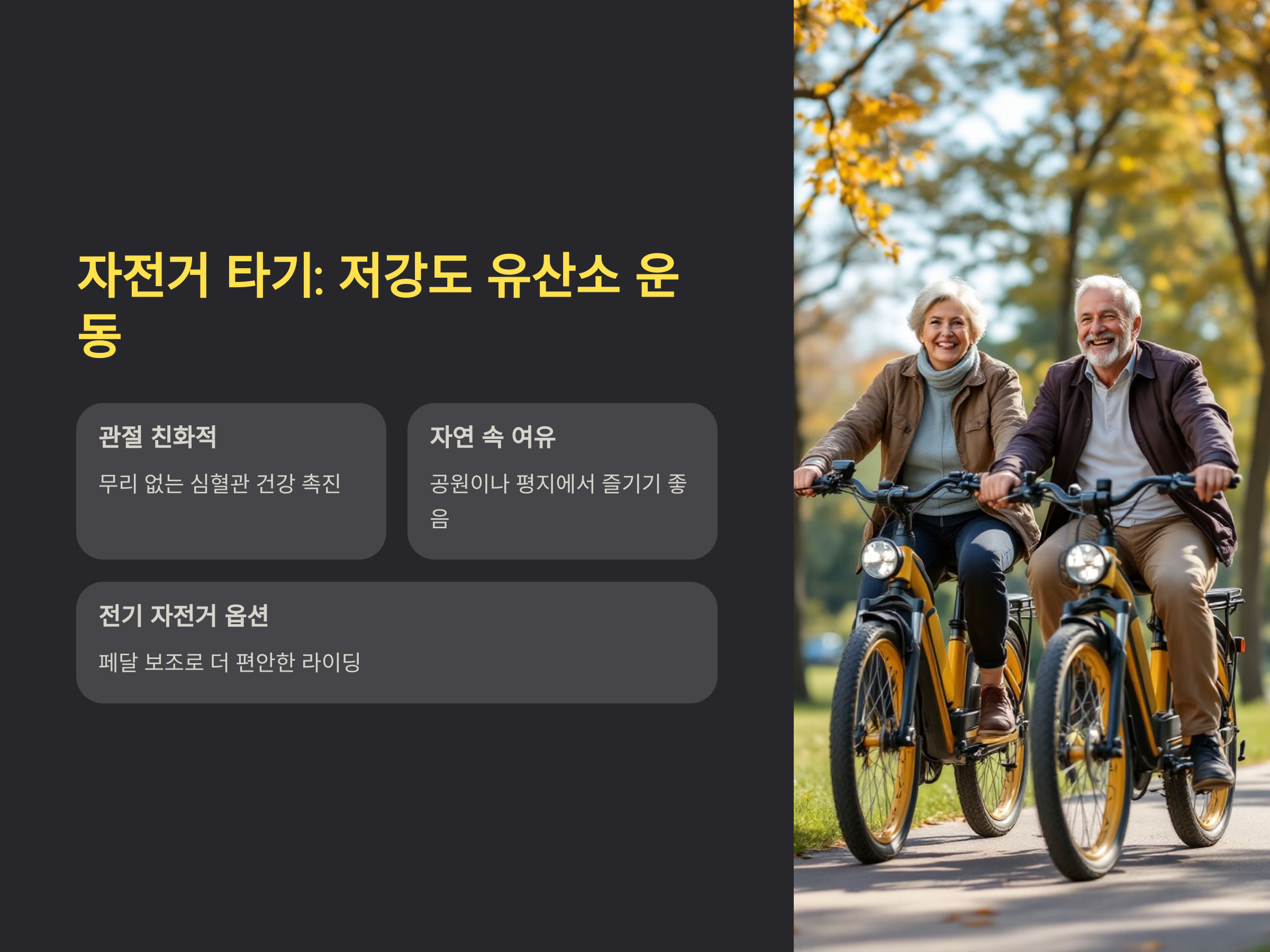자전거 타기는 관절에 부담을 주지 않으면서도 심혈관 건강을 촉진할 수 있는 좋은 유산소 운동입니다. 평지나 공원에서 자전거를 타는 것은 몸에 무리가 가지 않으면서도 근육을 잘 발달시킬 수 있습니다. 또한, 자연을 즐기며 마음의 여유도 가질 수 있습니다.