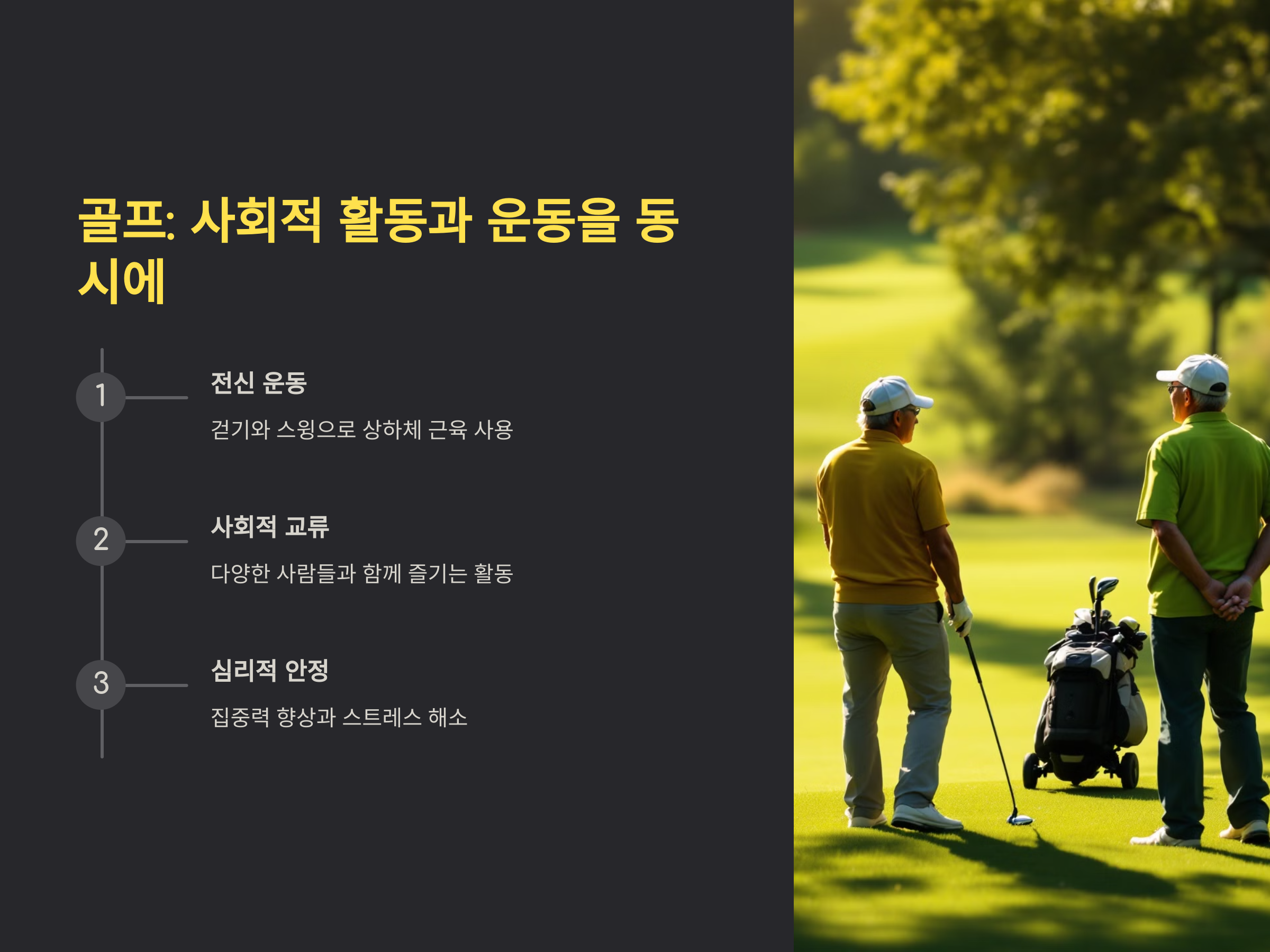 골프는 심리적인 안정을 취하면서도 체력을 증진할 수 있는 운동으로, 60대 이상에서도 즐기기에 적합합니다.