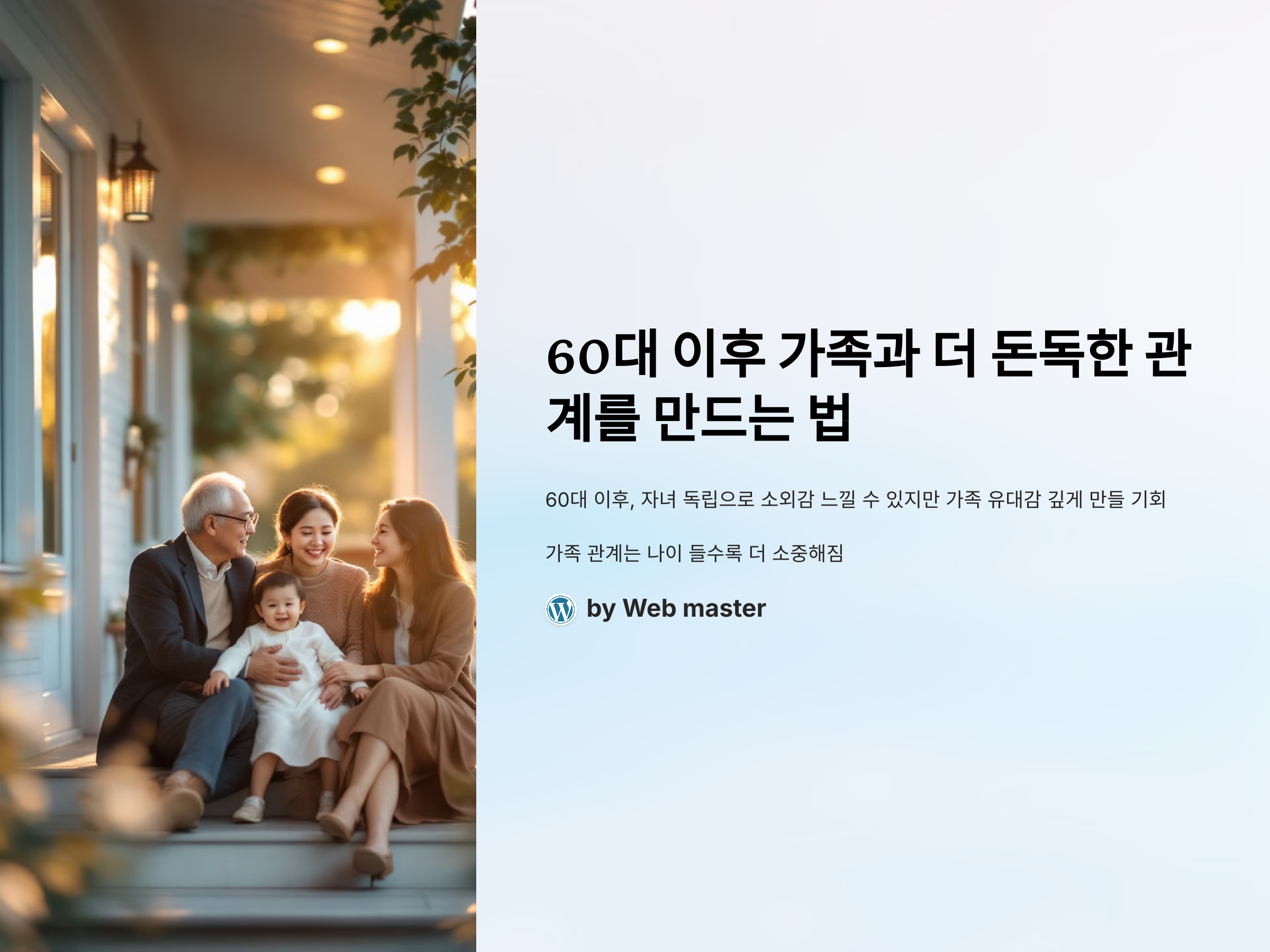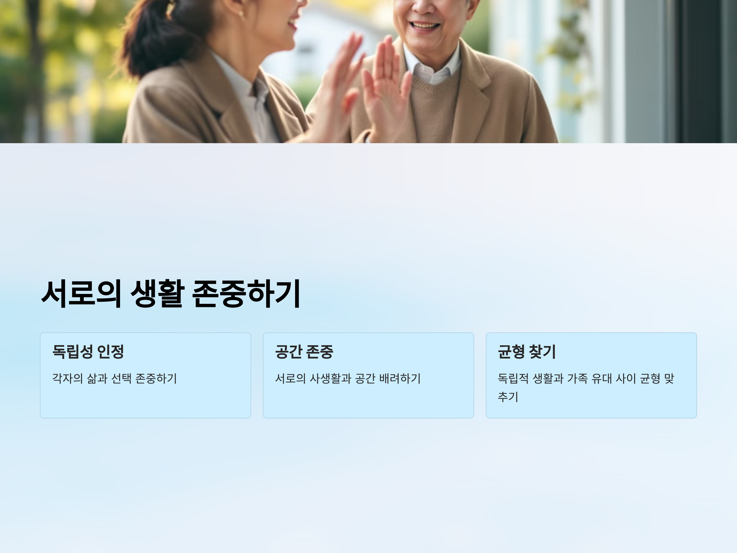 60대 이후에는 자녀들이 독립적인 삶을 살아가며, 부모님도 새로운 삶의 방식을 추구할 수 있습니다. 가족 간의 관계에서 중요한 점은 서로의 생활을 존중하는 것입니다. 자녀가 독립하고, 부모님도 새로운 취미나 활동을 시작할 수 있는 시간이 생기는데, 서로의 사생활과 공간을 존중하는 것이 중요합니다.