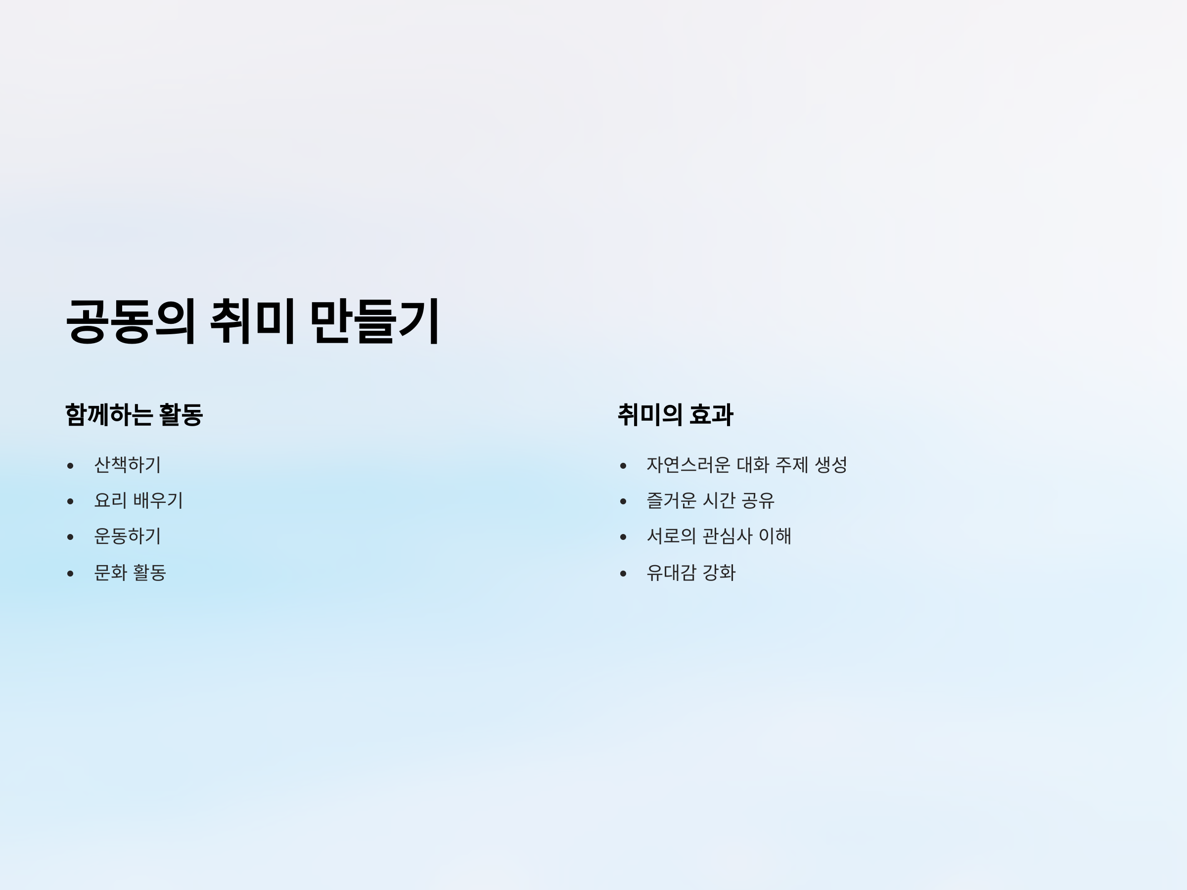 공동의 취미를 통해 자연스럽게 대화의 주제가 생기고, 함께 즐거운 시간을 보내면서 서로의 관심사를 알게 되는 기회가 됩니다. 이 과정에서 가족 간의 긴밀한 유대가 자연스럽게 생기고, 상호 이해와 존중이 쌓이게 됩니다.