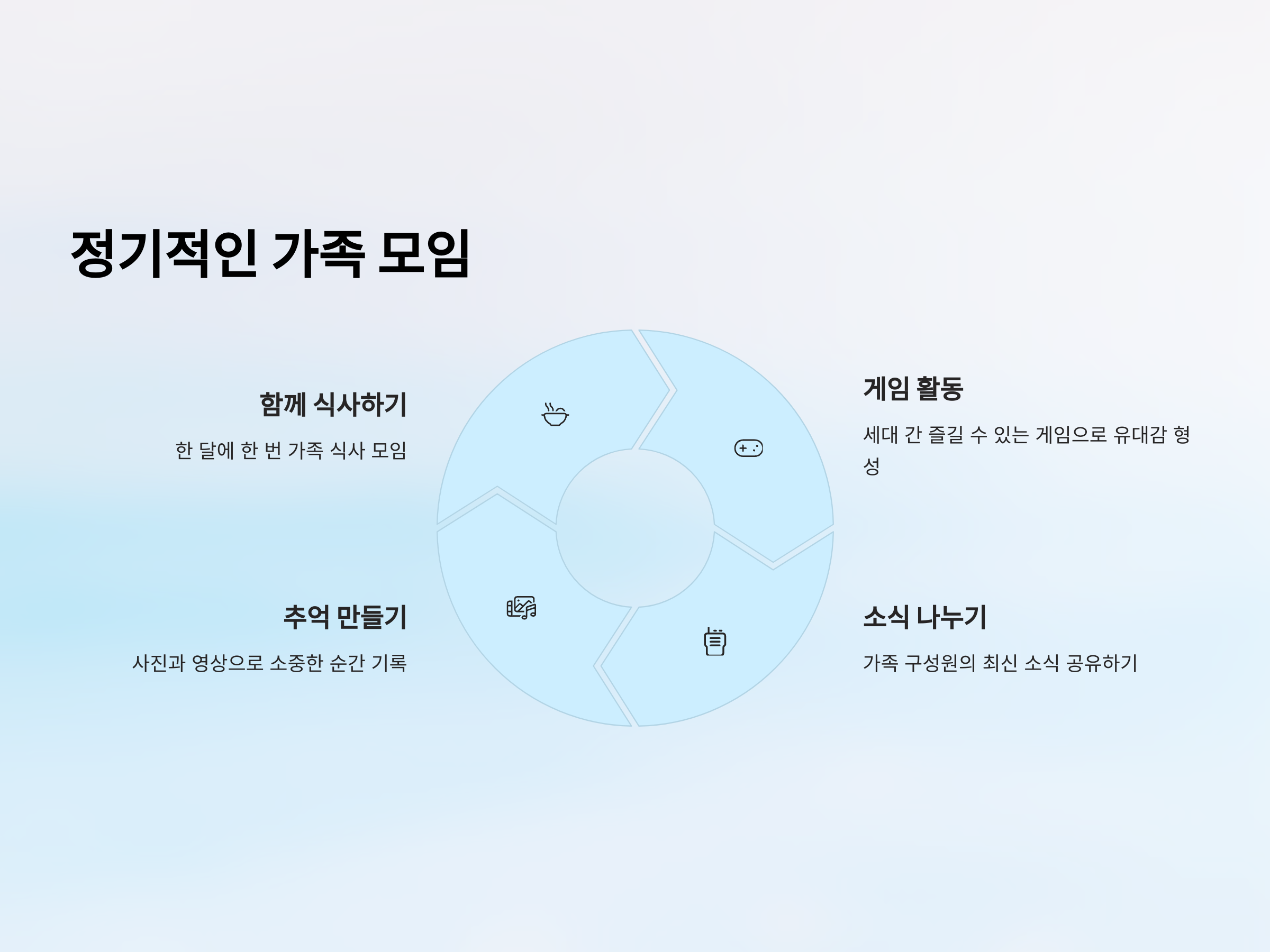 가족끼리 정기적으로 모임을 갖는 것도 매우 효과적인 방법입니다. 특히 60대 이후에는 가족들이 흩어져 살기 때문에, 한 달에 한 번 정도의 가족 모임을 계획하는 것이 좋습니다. 이 모임에서는 자주 대화를 나누고, 가족 구성원들의 최신 소식도 공유하며, 함께 시간을 보내는 것입니다. 가족 간의 유대감을 형성하는 데 큰 도움이 될 뿐만 아니라, 자녀들에게도 중요한 가치를 전달할 수 있습니다.