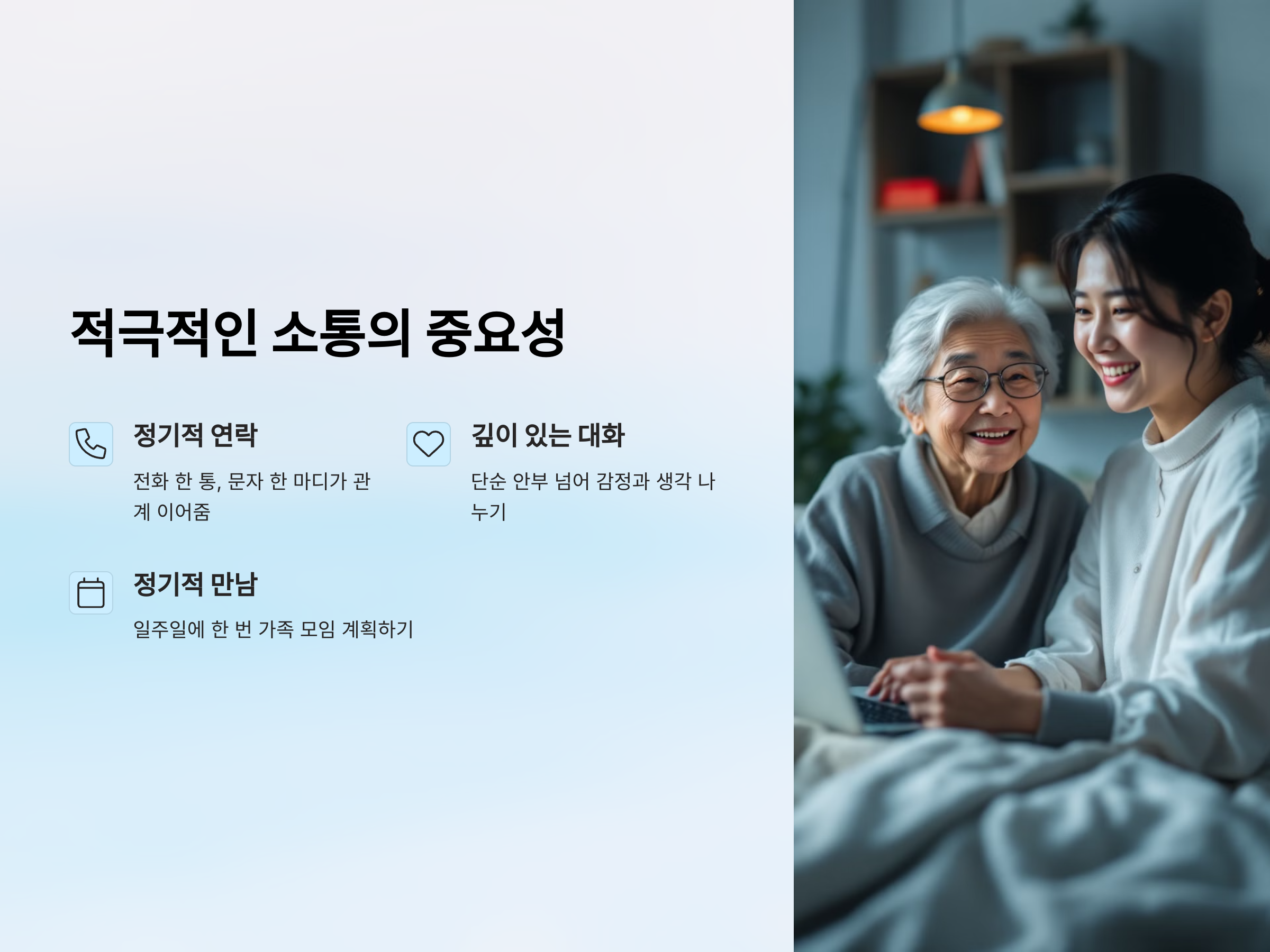 소통의 질도 중요합니다. 단순한 안부를 묻는 것에서 그치지 않고, 서로의 감정과 생각을 나누며 깊이 있는 대화를 나누는 것이 필요합니다. 60대 이후에는 자녀들도 자주 바쁘고, 부모님도 점차 외로움을 느낄 수 있기 때문에 더욱 세심한 배려가 필요합니다. 일주일에 한 번이라도 가족 모임을 가지거나, 한 달에 한 번씩 자녀들이 부모님을 방문하는 등의 계획을 세워보세요. 그 작은 습관이 관계를 더욱 돈독하게 만듭니다.