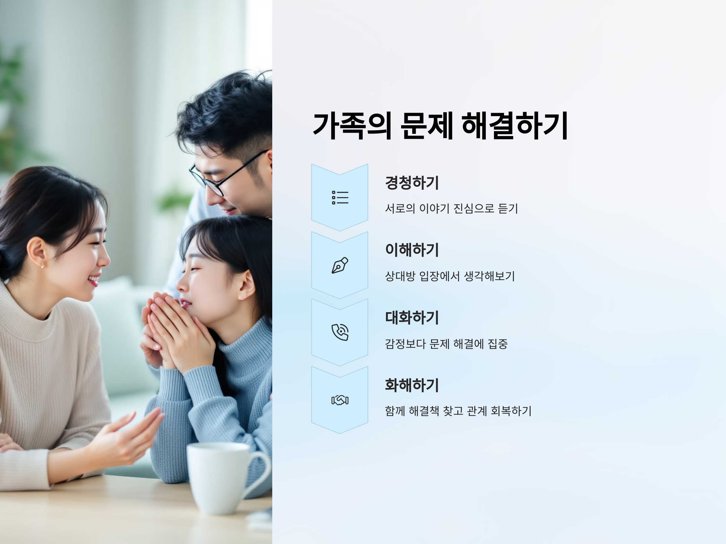 이때, 화를 내거나 감정을 앞세우기보다는 서로의 입장에서 이해하려는 노력이 중요합니다. 가족은 서로의 문제를 함께 해결해 나가는 동반자임을 기억하고, 문제 해결에 있어서도 협력하는 자세가 필요합니다.