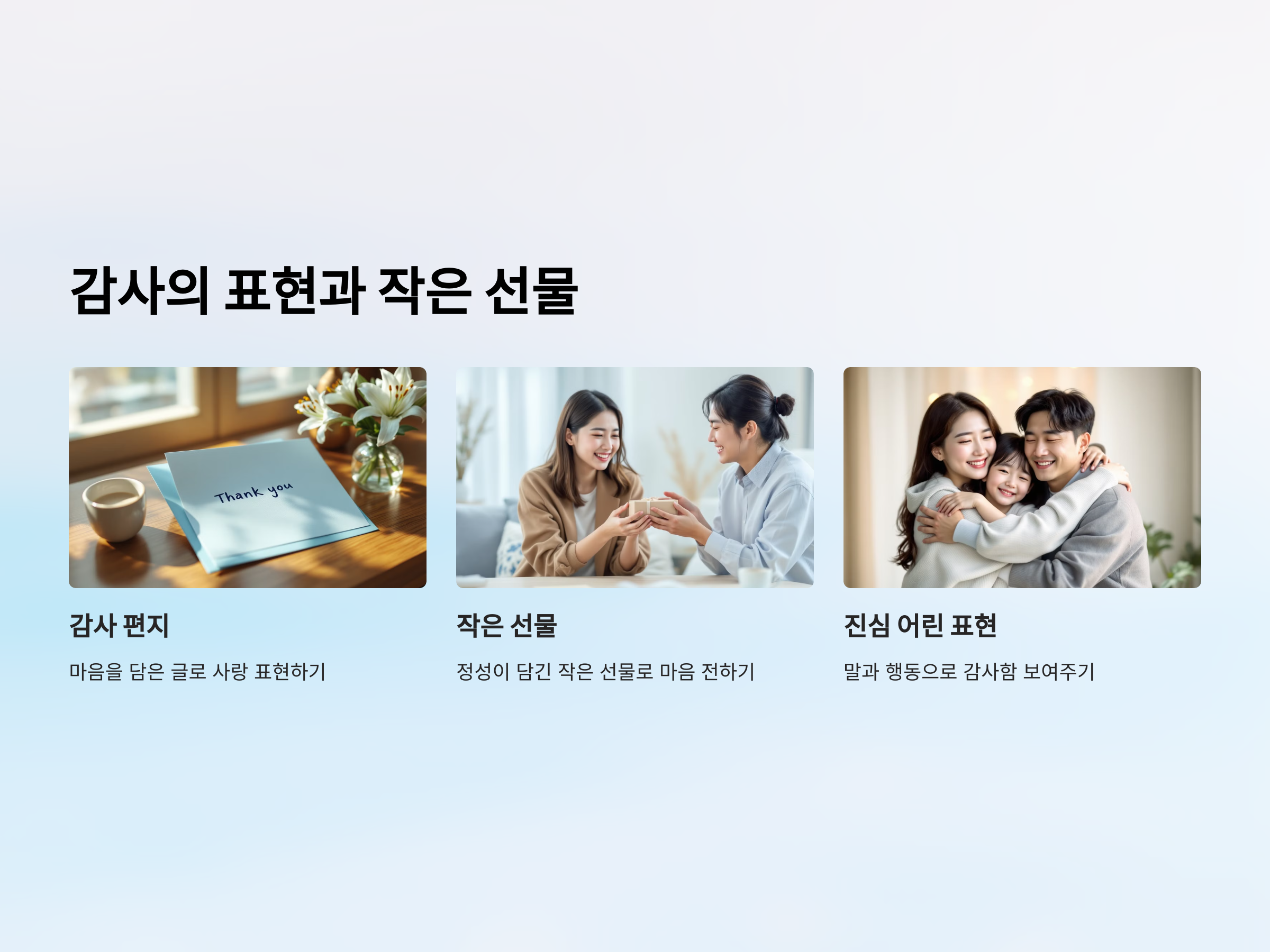 가족과의 관계를 돈독히 만드는 또 하나의 방법은 감사의 표현과 작은 선물입니다. 자녀가 부모에게 감사하는 마음을 표현하는 것은 매우 중요합니다. 부모님께서 자녀들에게 얼마나 사랑을 주었는지, 그리고 그 사랑을 자녀들이 어떻게 받아들이고 있는지를 자주 표현하는 것이 필요합니다. 또한, 부모님도 자녀들에게 작은 선물이나 감사의 말을 전하는 것이 좋습니다.