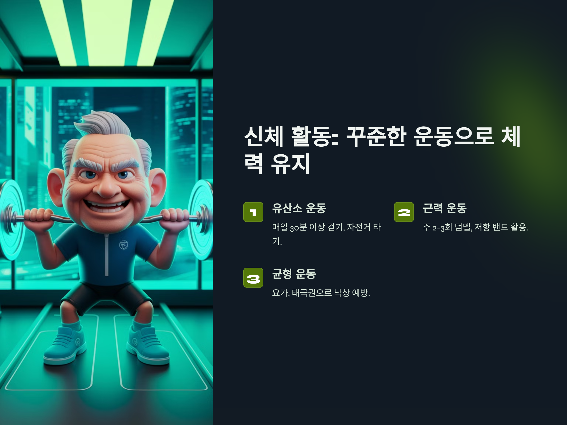 근력 운동은 근육을 유지하고 강화하는 데 중요한 역할을 합니다. 60대 이후에는 근육량이 자연스럽게 감소하기 때문에, 가벼운 덤벨이나 저항 밴드를 활용한 근력 운동을 주 2-3회 꾸준히 하는 것이 좋습니다. 또한, 근력 운동은 골밀도를 유지하는 데에도 효과적입니다.